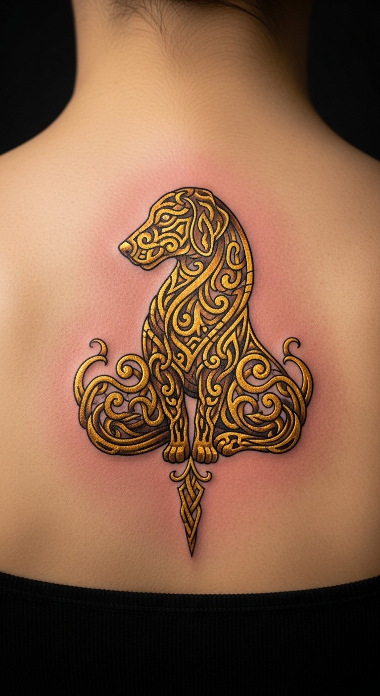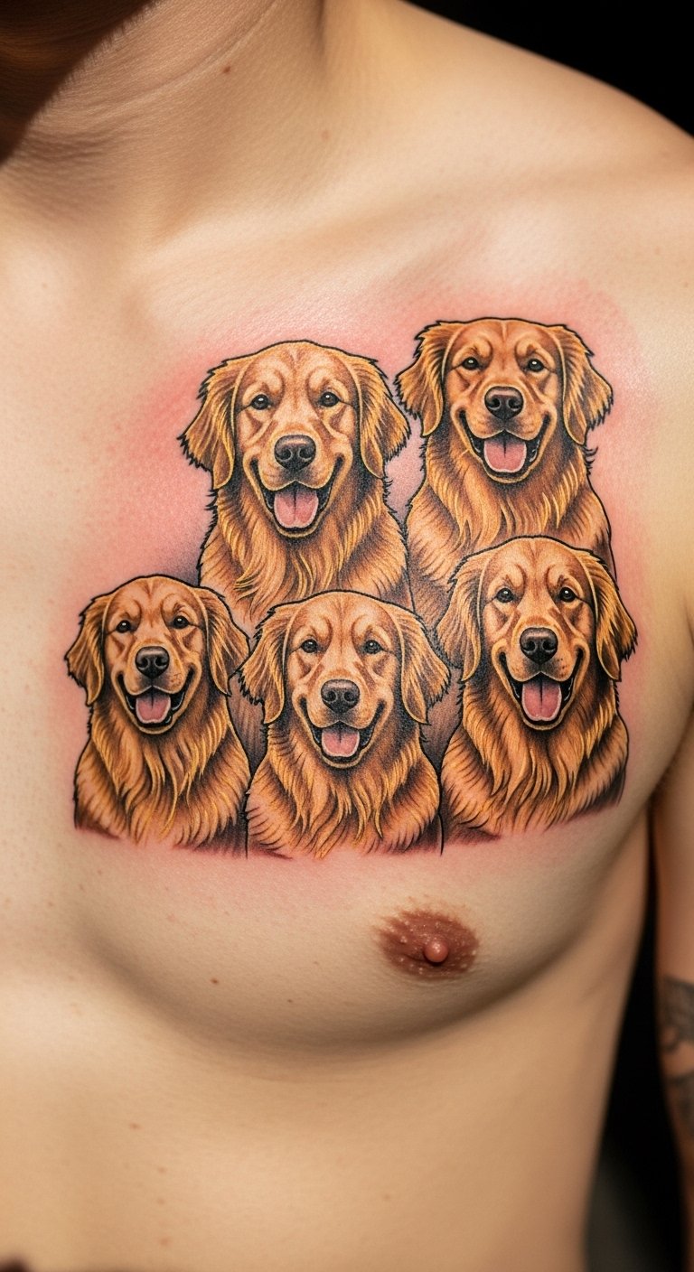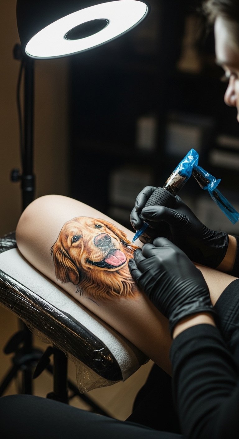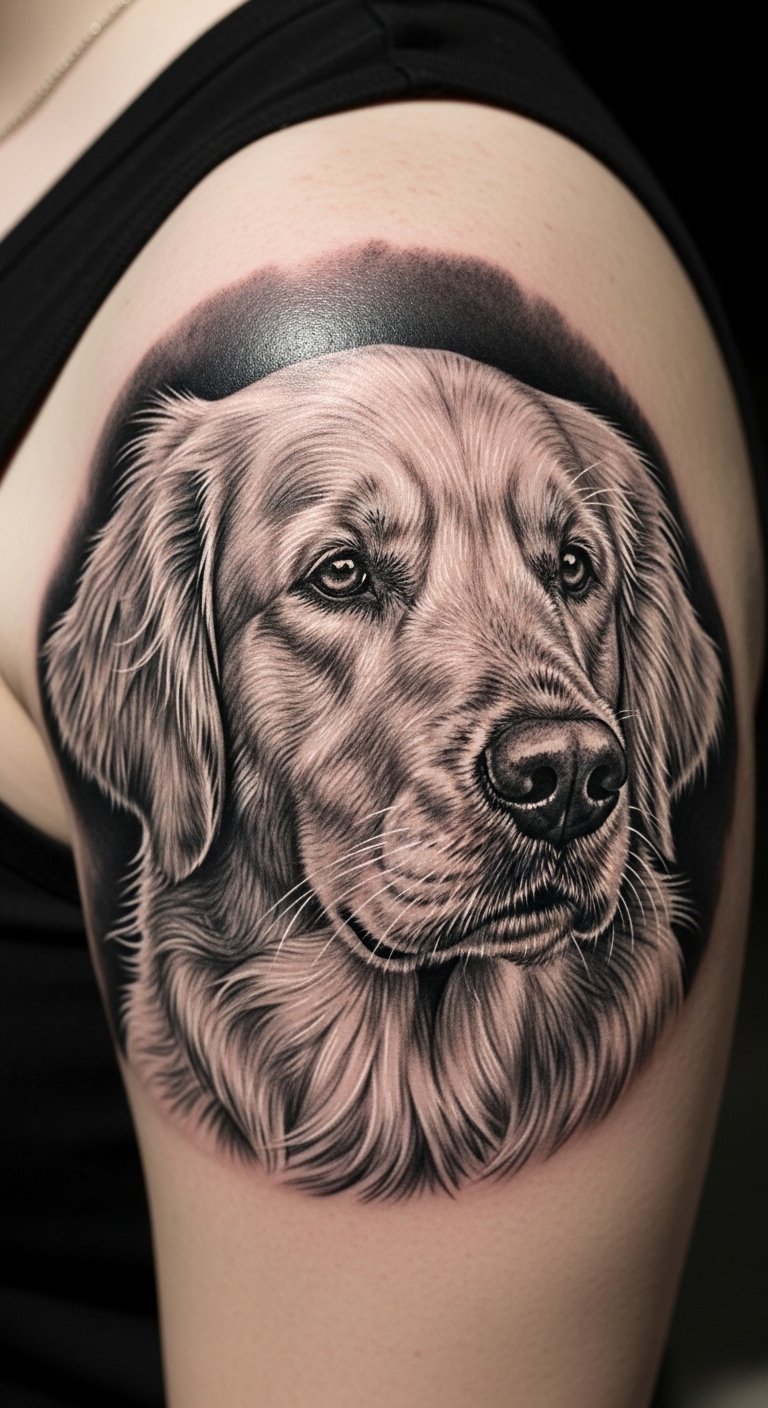 Picture a sleek line drawing of a Golden Retriever’s face. This style keeps things simple and elegant. Start with a basic sketch on paper at home using a pencil. It costs little and helps you visualize. Add your pet’s name for a personal touch. Go for a small size to save on artist fees. You might find free online templates to trace. This approach fits beginners. Try it on temporary tattoo paper first—it’s affordable and reusable. Focus on spots like the wrist for easy hiding. You’ll love how it highlights loyalty without overwhelming your skin. Keep maintenance easy with daily moisturizer.
