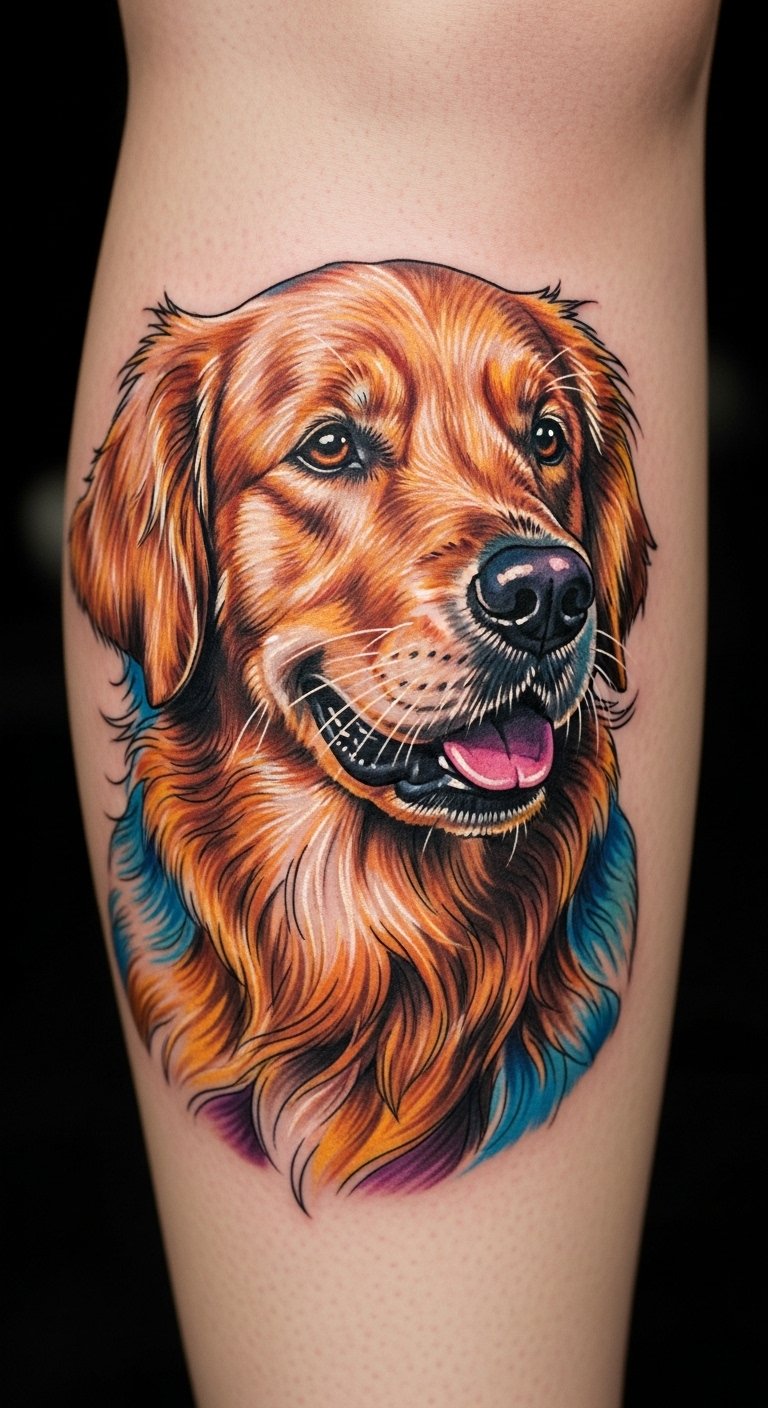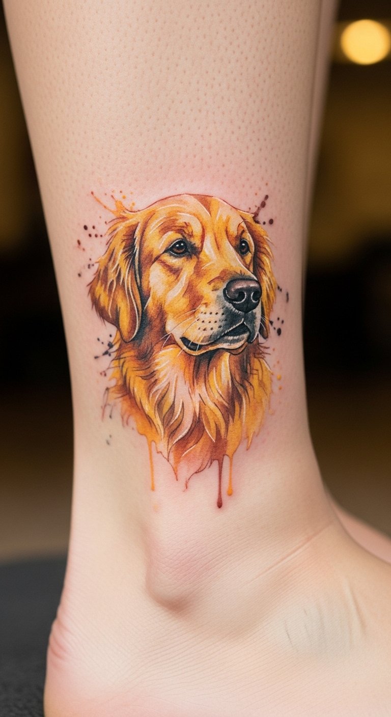Try a colorful watercolor effect on your Golden Retriever tattoo. It adds fun with blended hues like gold and soft blues. Experiment at home with watercolors on paper. Buy cheap supplies from a craft store. Layer colors to mimic fur patterns. This DIY step saves money and sparks ideas. Opt for a small area like the ankle to reduce pain and cost. Share your sketches online for free feedback. It celebrates love in a fresh way. Seal the design with affordable lotions later.