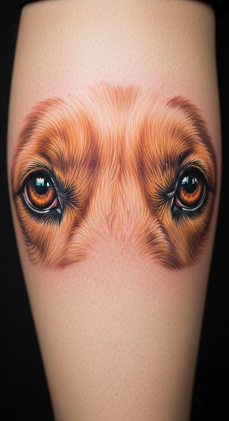 Capture those soulful eyes in a close-up. Draw them on a photo at home. Use free apps for guidance. Keep the design compact. This saves money on ink. Place it on your calf for comfort. Test with makeup pencils first. It’s an emotional, budget win.