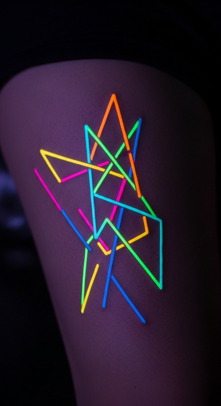 Neon geometric abstract brings electric colors to your body art. Shapes glow like city lights. Go for a small ankle version to save money. Create mock-ups with colored pencils at home. Look for neon specials at studios. Opt for vibrant but cheap inks. Test with glow-in-the-dark stickers. Pair with night-out clothes. Add a star burst for flair. The application is straightforward. This design lights up your style. Use free tools to visualize it. Light up your look without spending much.