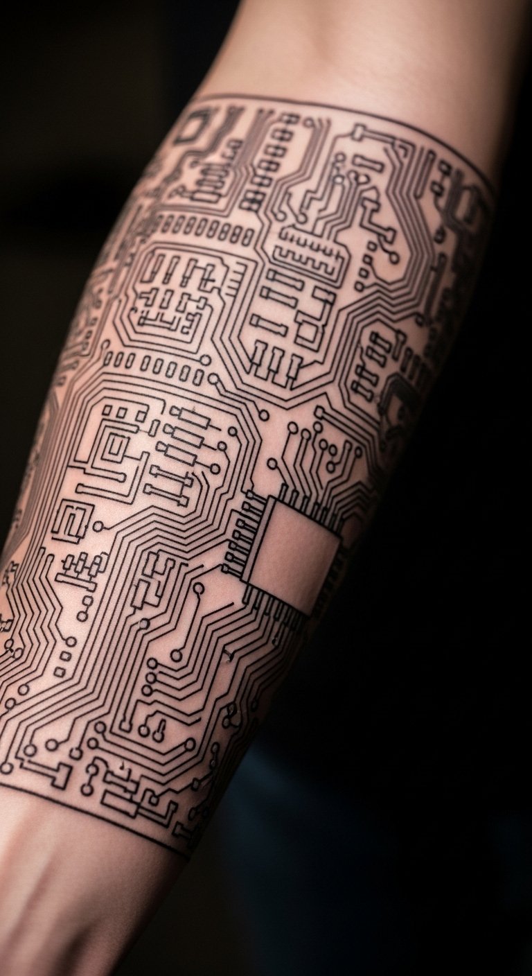 A circuit board blueprint tattoo mimics tech circuits on your skin. It’s perfect for gadget lovers. Start with a wrist design. Draw circuits on paper quickly. Search for tech-themed deals. Go with fine black lines. Use electronic tape for trials. Match with geeky outfits. Add a battery symbol. The process is efficient. This tattoo techs up your look. Visualize via free apps. Wire your body art cheap.