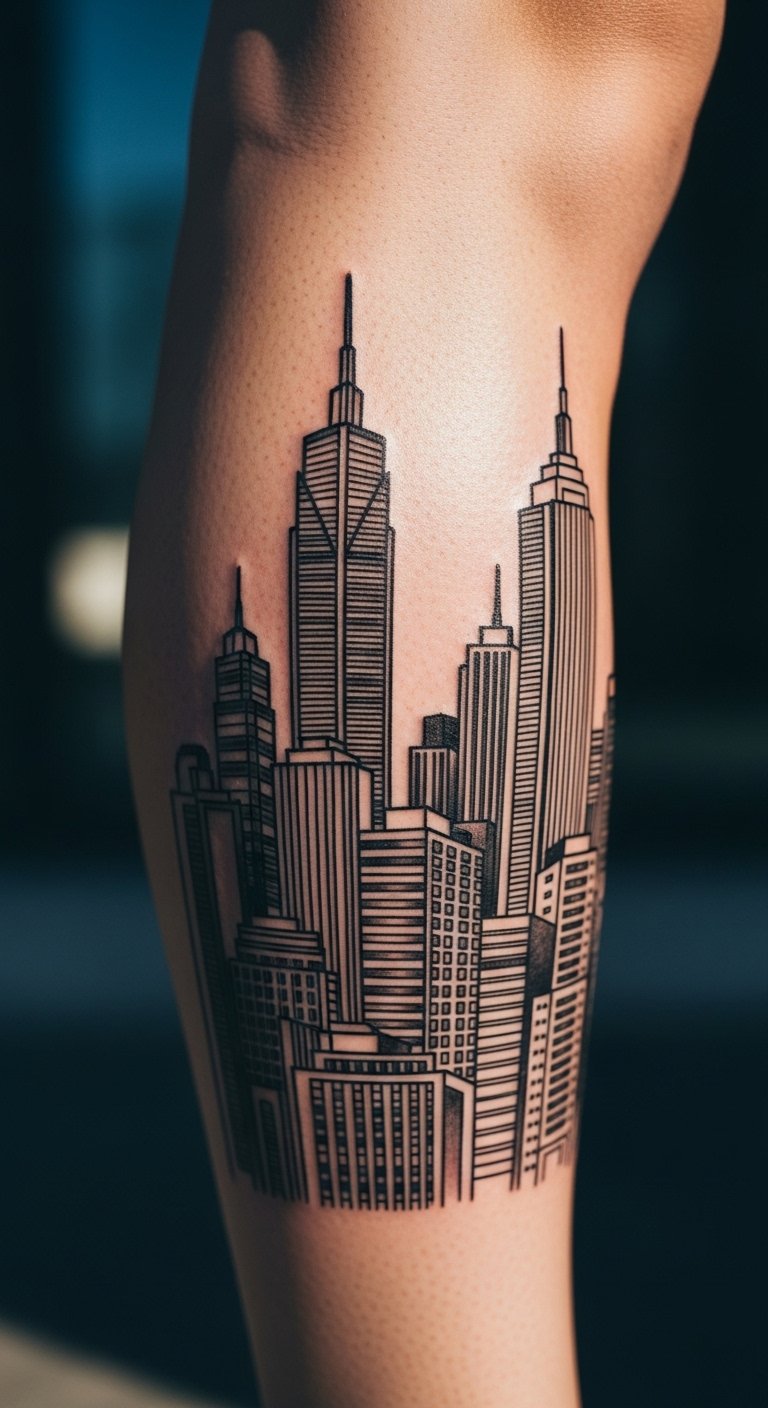 An urban cityscape outline builds your city on skin. Skyscrapers in lines. Try a leg piece. Draw cityscapes at home. Search for urban deals. Use bold outlines. Test with city prints. Wear with city vibes. Include a window element. Sessions build up. This design outlines your world. Use apps to cityscape. Outline affordably.
