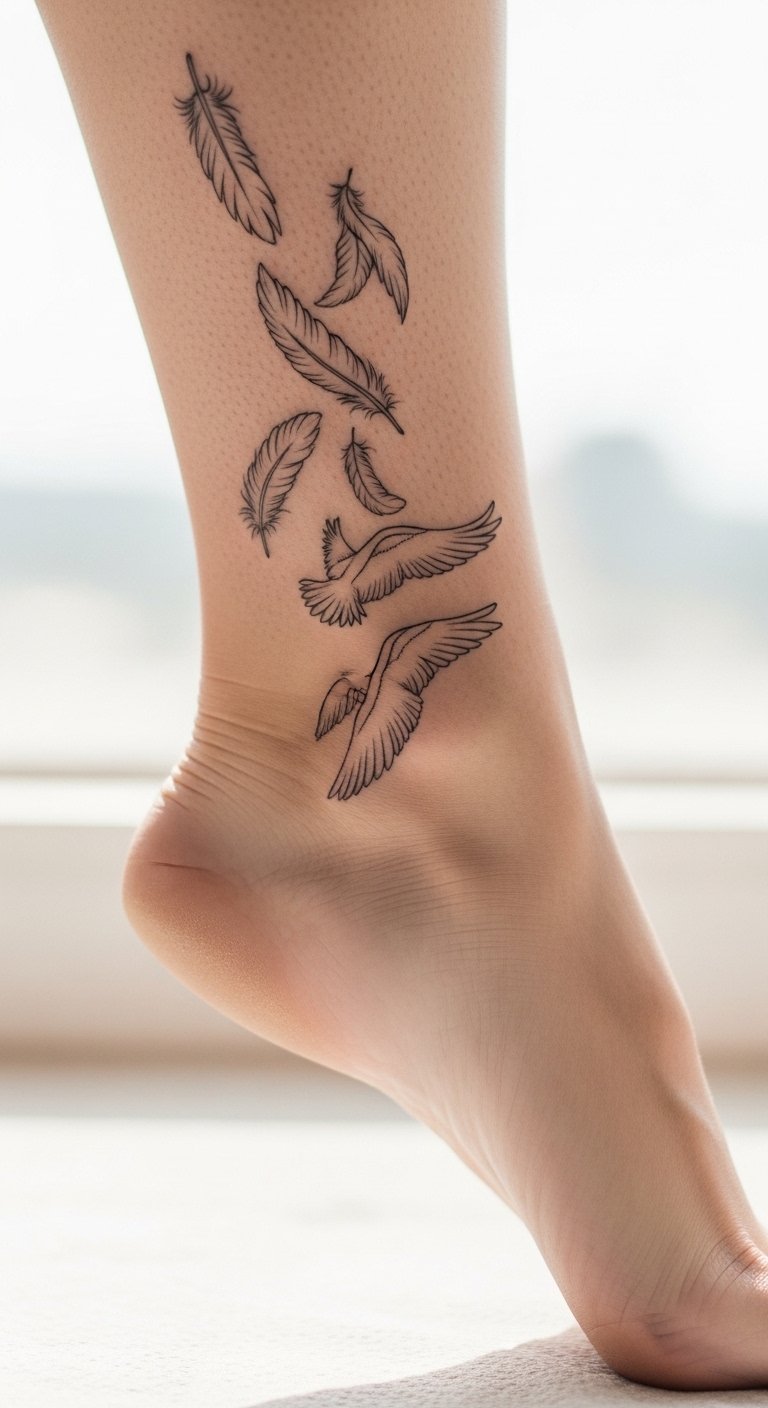 A feather flight design lets you fly in ink. Feathers that soar. Try an ankle piece. Sketch feathers at home. Check for flight deals. Use light lines. Experiment with feather stamps. Wear with free spirit clothes. Add a wind element. The art lifts high. This design flights your look. Use apps for feathers. Fly cheap.