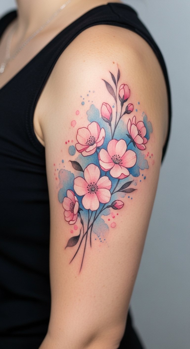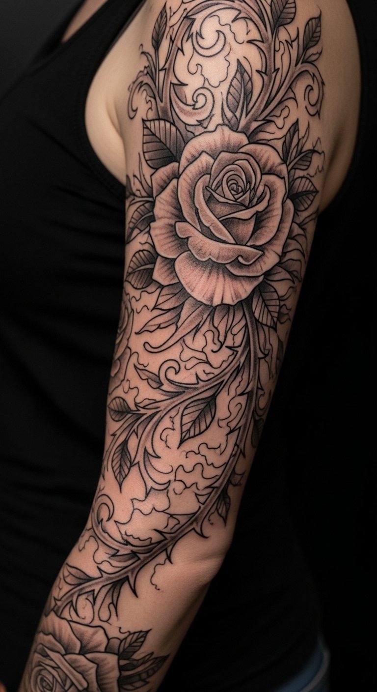 Picture soft petals and leaves flowing from shoulder to elbow. This design brings a dreamy feel with easy colors. Start by drawing simple flowers on paper at home. Use free online tools to mix hues before visiting an artist. Think about what flowers mean to you, like a rose for growth. Save money by sketching ideas yourself instead of buying templates. Add personal touches, such as a favorite bloom in the center. This style hides well under sleeves for work. Try a budget app to preview it on your photo. Keep sessions short to manage any discomfort. You’ll love how it enhances your daily outfit.