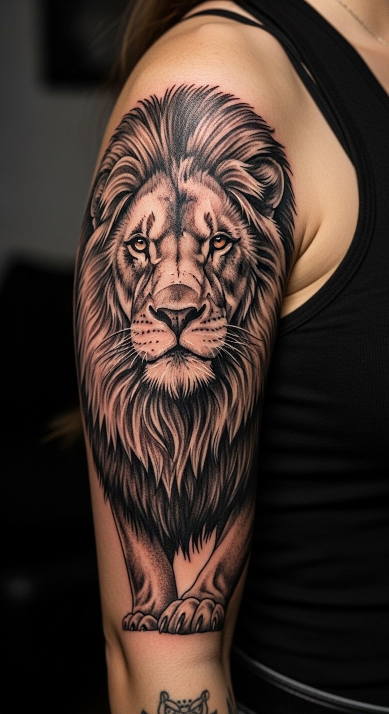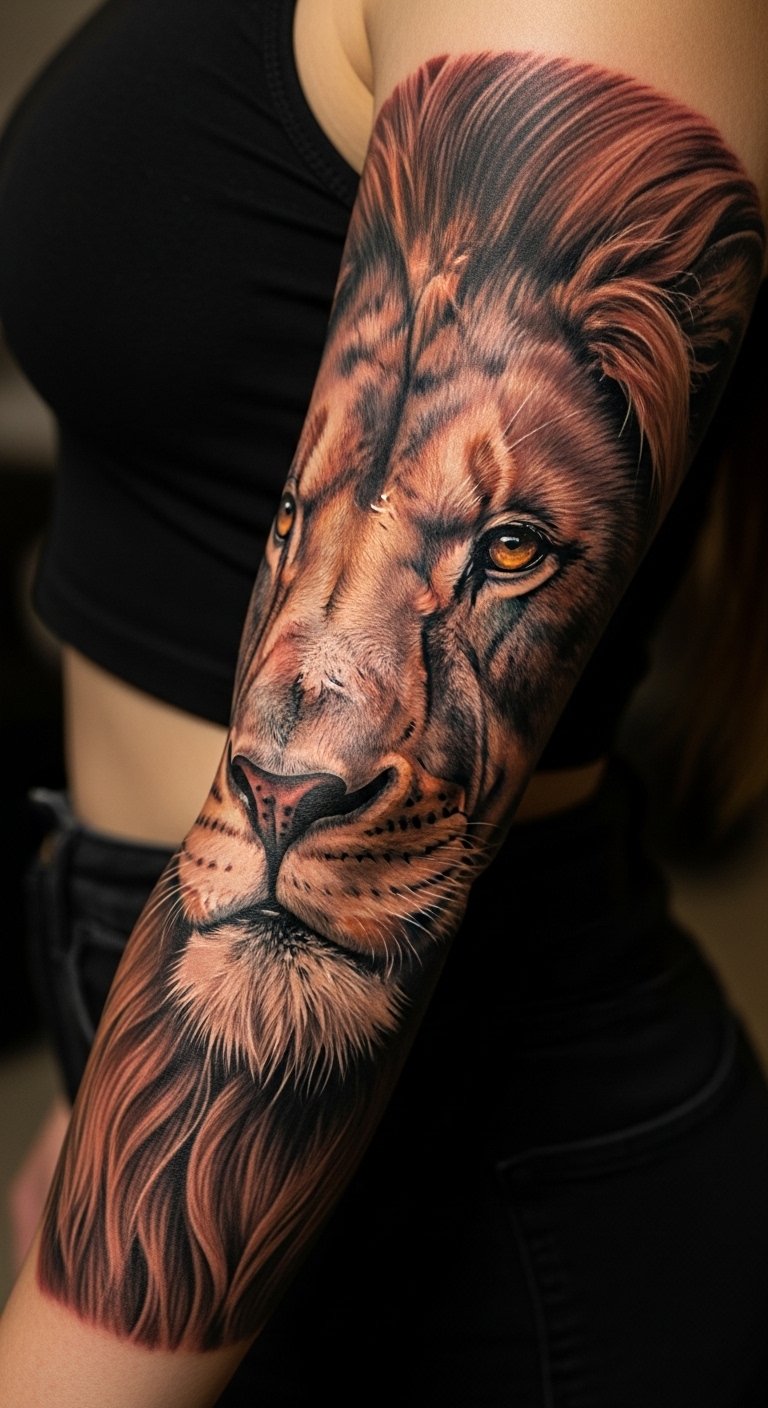 A lion roars confidence on your arm. Think of its mane flowing down. Sketch a lion head quickly. Relate it to your life story. Free programs let you visualize it. Save by focusing on key features. Wear breathable clothes while it heals. This design empowers your everyday look.