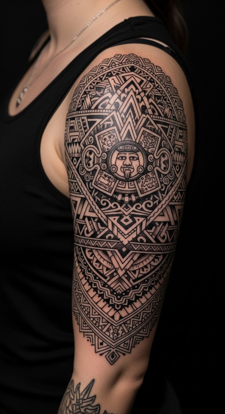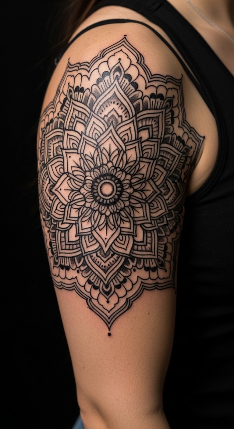 Bold black lines form calming mandalas. See them swirling from shoulder down. Practice drawing circles and swirls on paper. Add elements that matter to you, like a central symbol. Use budget software to see it first. This cuts down on changes later. Opt for one color to keep things affordable. Cover it with a shirt if needed. The design looks striking yet simple.