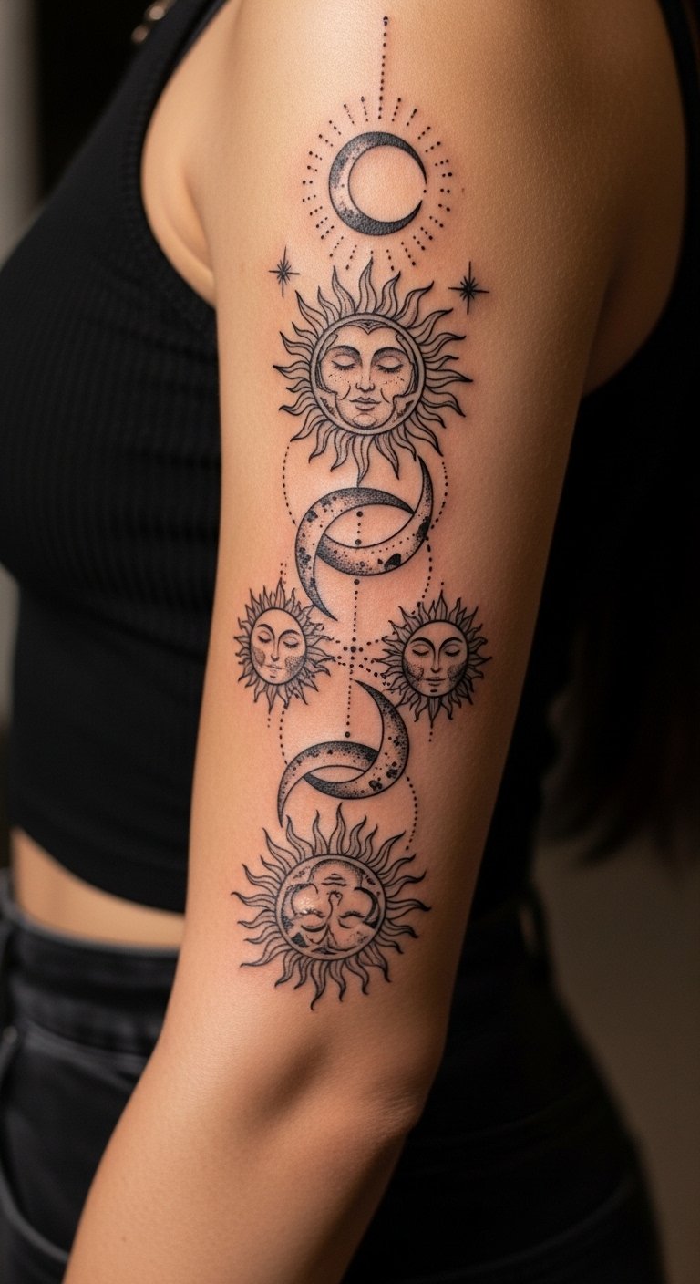 Sun and moon together show balance on your skin. Imagine them glowing on your arm. Sketch the symbols in a journal at home. Think about their meaning for you. Free apps help you place them virtually. This makes planning easy and cheap. Go for basic outlines to save money. Protect the area with soft fabrics during healing. It’s a subtle way to express duality.