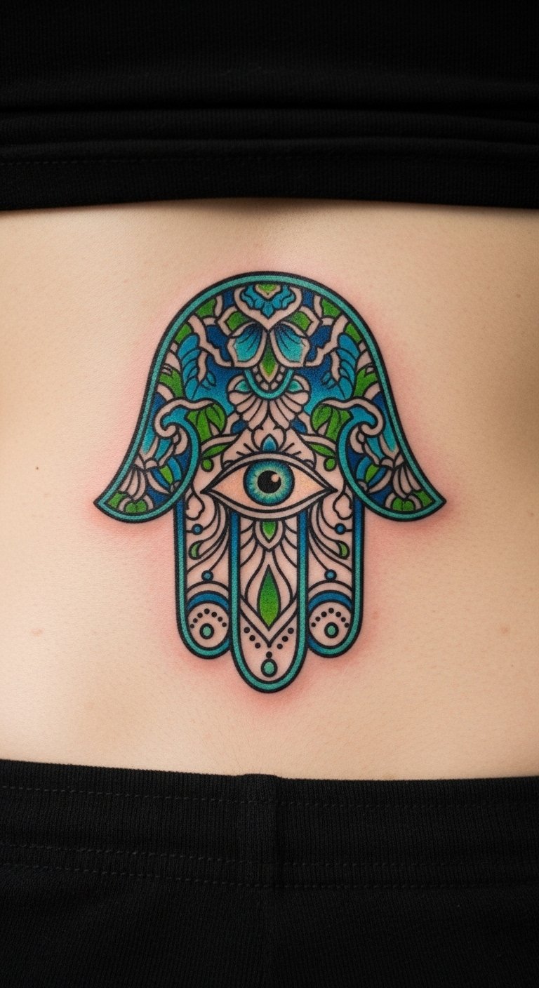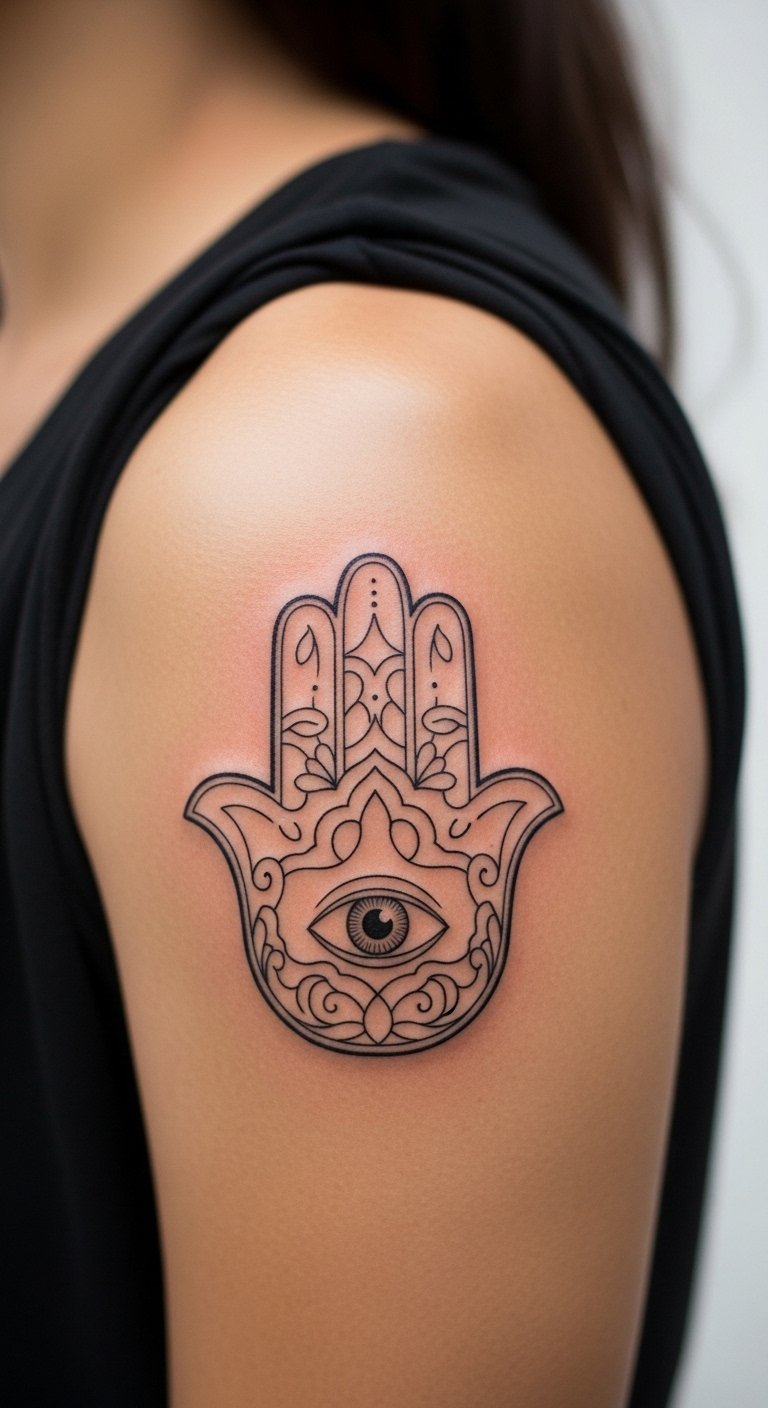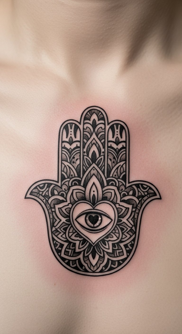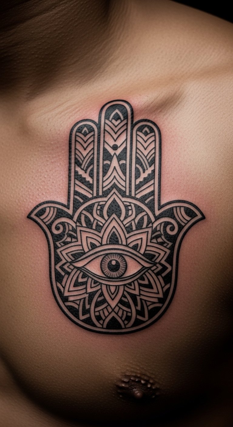 Place Hamsa on your shoulder for top protection. This spot guards your back and heart. It’s practical for everyday wear. Sketch it to fit your body. Use phone apps for free layouts. Artists charge around $100 for this area. Choose small sizes to ease pain. Practice with body paint at home. Break it: measure, design, book. This position feels secure. Add personal symbols for flair. Get started today.