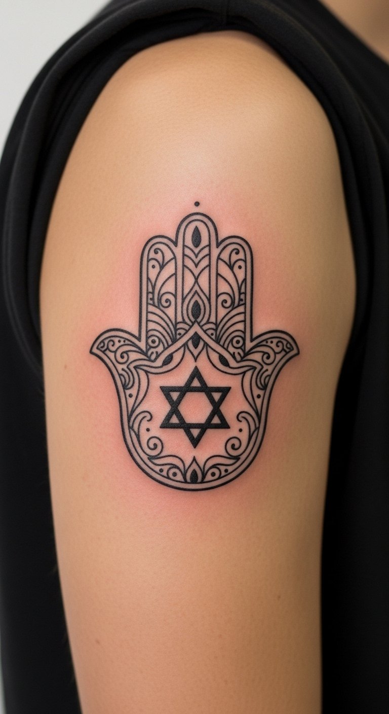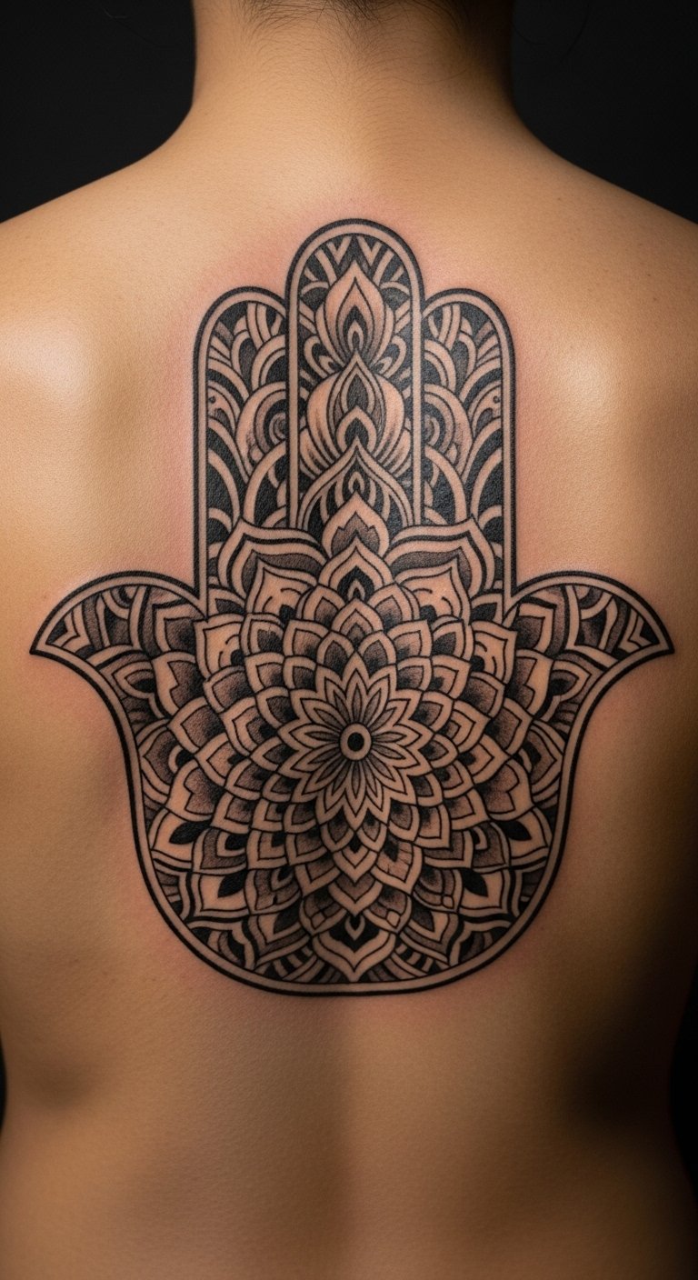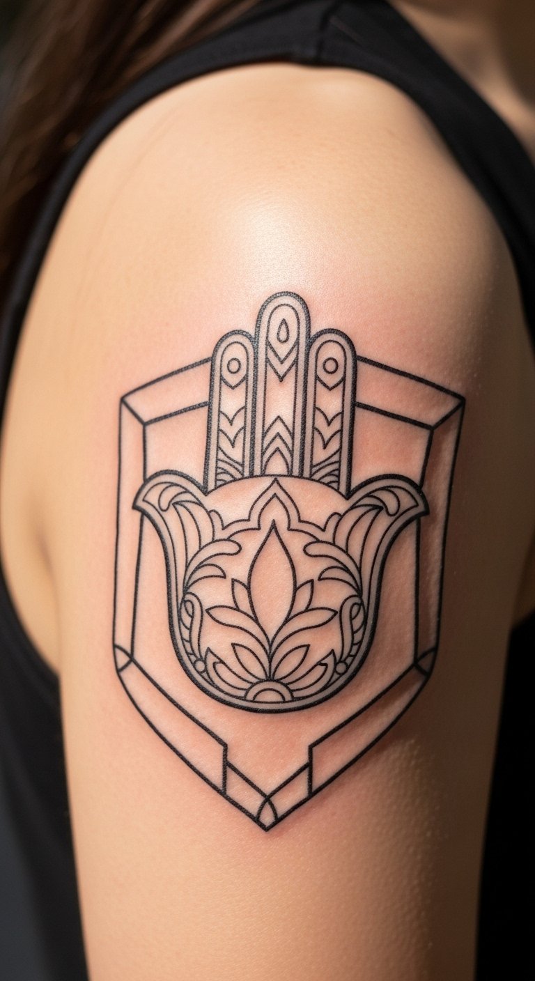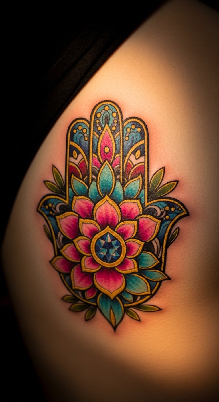 Place Hamsa on your shoulder for top protection. This spot guards your back and heart. It’s practical for everyday wear. Sketch it to fit your body. Use phone apps for free layouts. Artists charge around $100 for this area. Choose small sizes to ease pain. Practice with body paint at home. Break it: measure, design, book. This position feels secure. Add personal symbols for flair. Get started today.