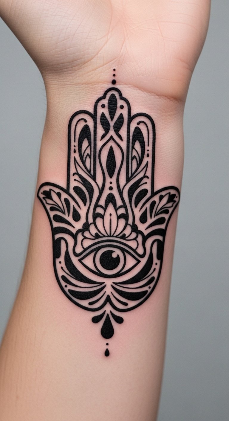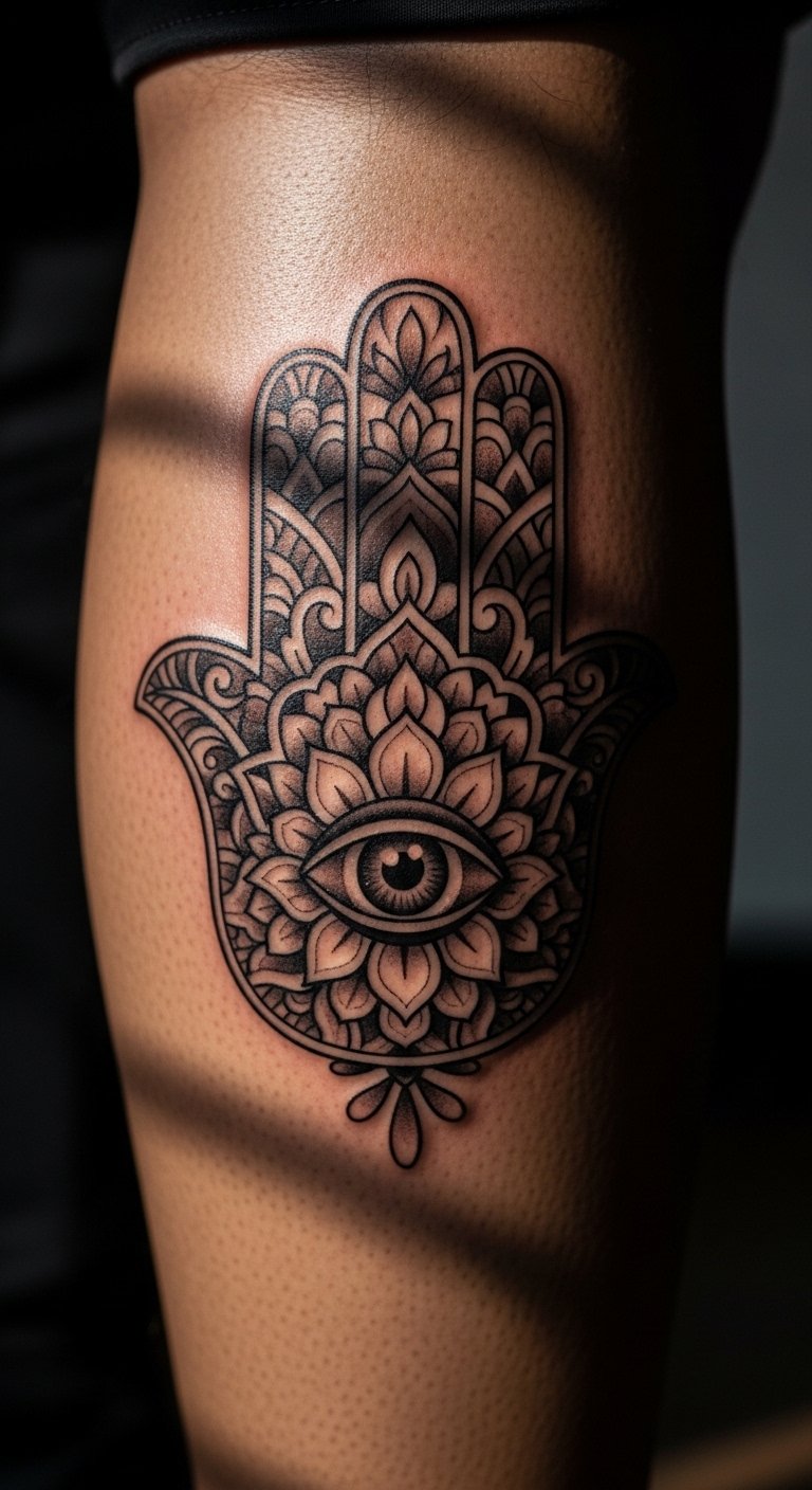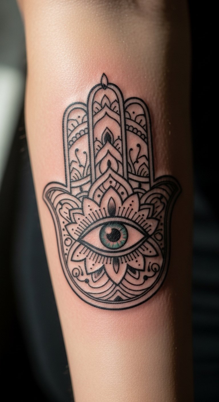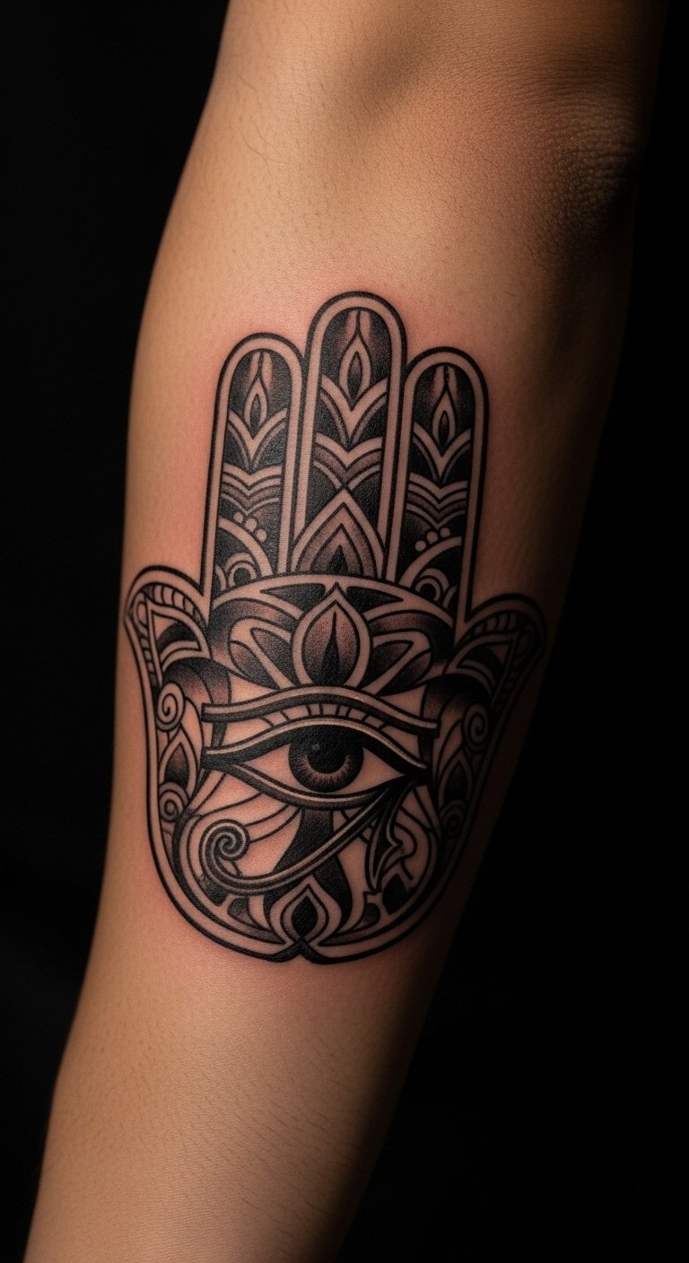 Blend the Hamsa with the Eye of Horus for extra guard. This eye in the palm watches over you. It mixes ancient vibes for solid defense. Think of it as your personal watchman. Grab a pencil and paper to mix designs yourself. Free websites offer templates to tweak. Look for artists at local fairs; prices hover around $90. Opt for grey shades to save on color costs. Test with stick-on tattoos from online shops for under $5. Break it down: choose your spot, draw it out, and book. This setup deflects negativity easy. Add a twist like rays from the eye. You’ll feel safer in no time. Keep actions simple: plan ahead and enjoy the process.