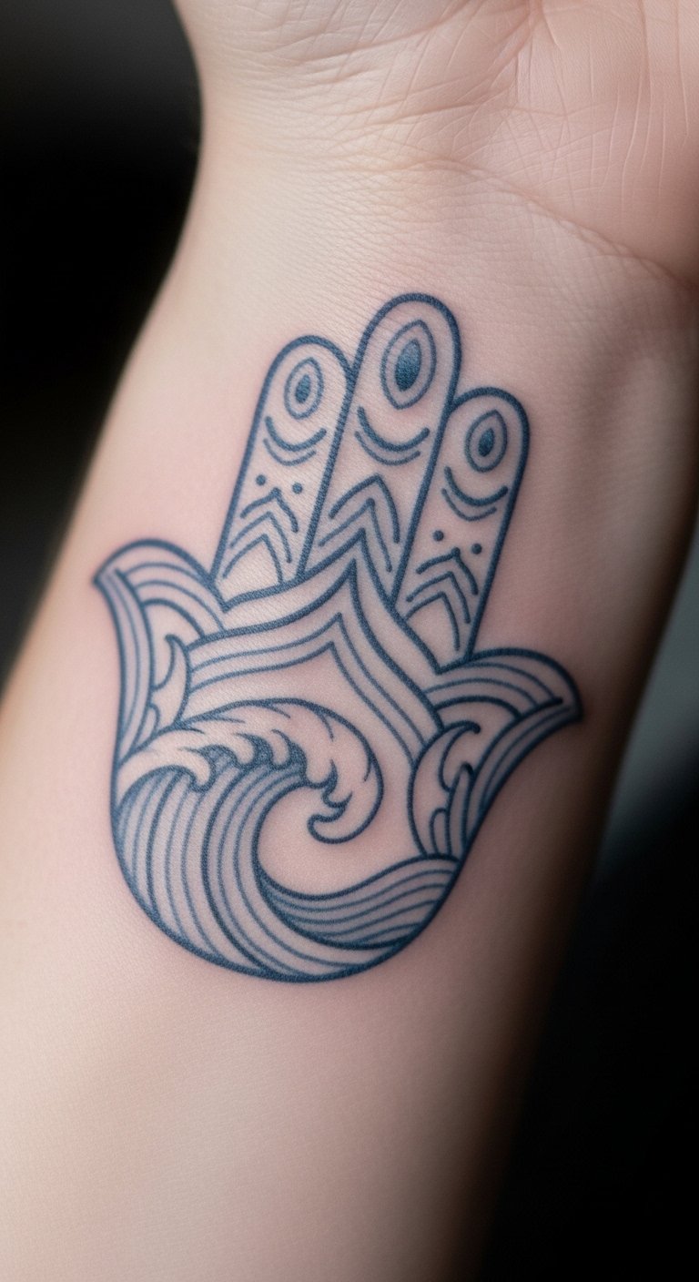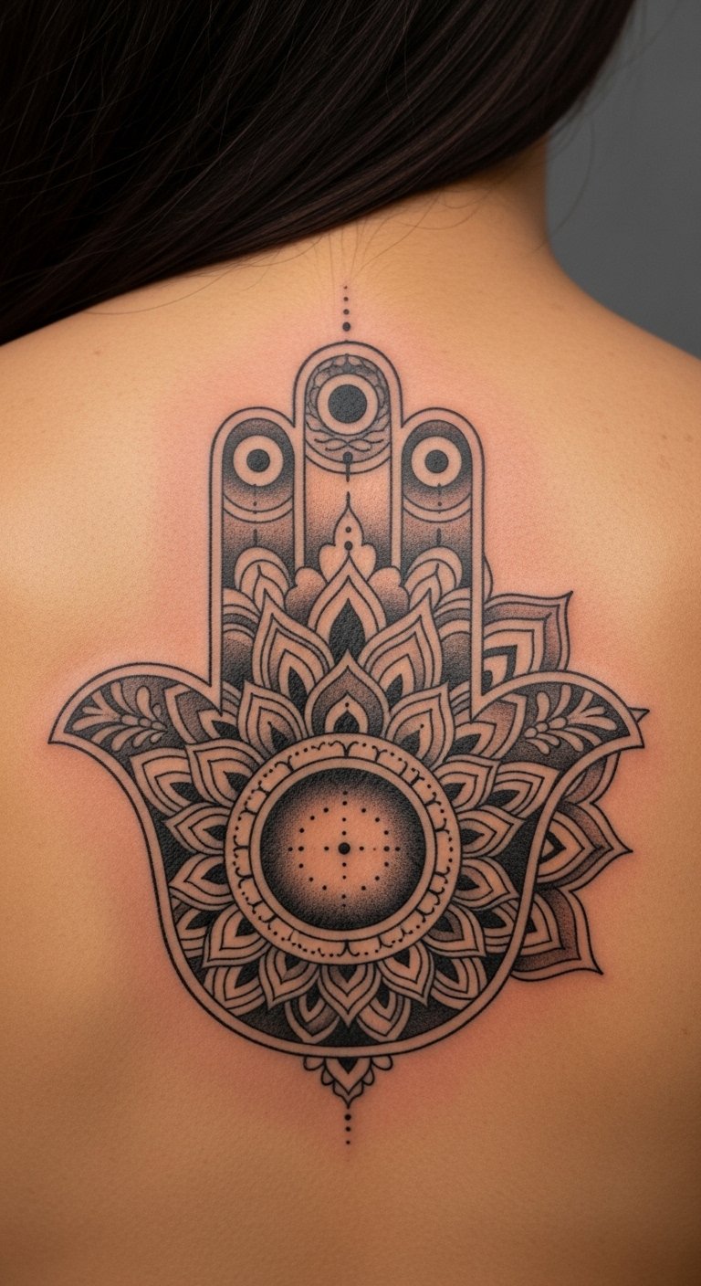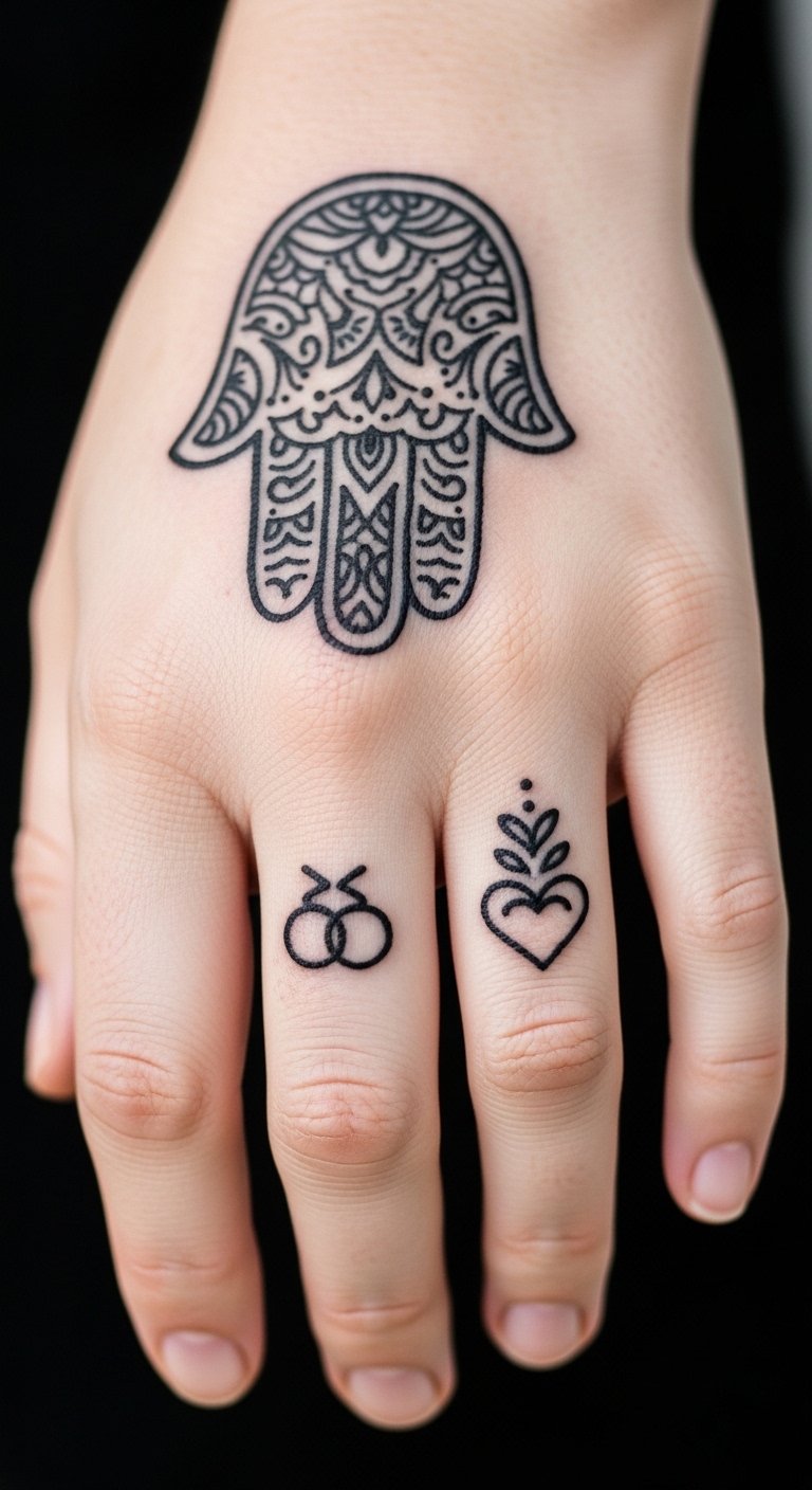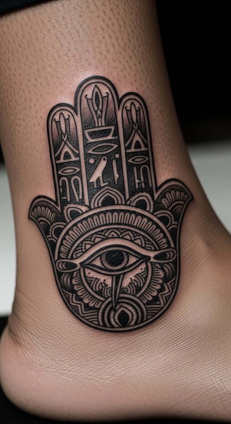 Blend the Hamsa with the Eye of Horus for extra guard. This eye in the palm watches over you. It mixes ancient vibes for solid defense. Think of it as your personal watchman. Grab a pencil and paper to mix designs yourself. Free websites offer templates to tweak. Look for artists at local fairs; prices hover around $90. Opt for grey shades to save on color costs. Test with stick-on tattoos from online shops for under $5. Break it down: choose your spot, draw it out, and book. This setup deflects negativity easy. Add a twist like rays from the eye. You’ll feel safer in no time. Keep actions simple: plan ahead and enjoy the process.