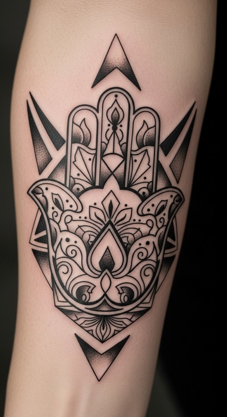Geometric Hamsa mixes shapes for a cool look. It protects while looking fresh. Think modern art on skin. Use rulers for home sketches. Free software aids design. Costs around $95. Keep it black for cheap. Try paper cutouts first. Steps: design, review, ink. This pattern stands strong. Add your twists. Start simple.