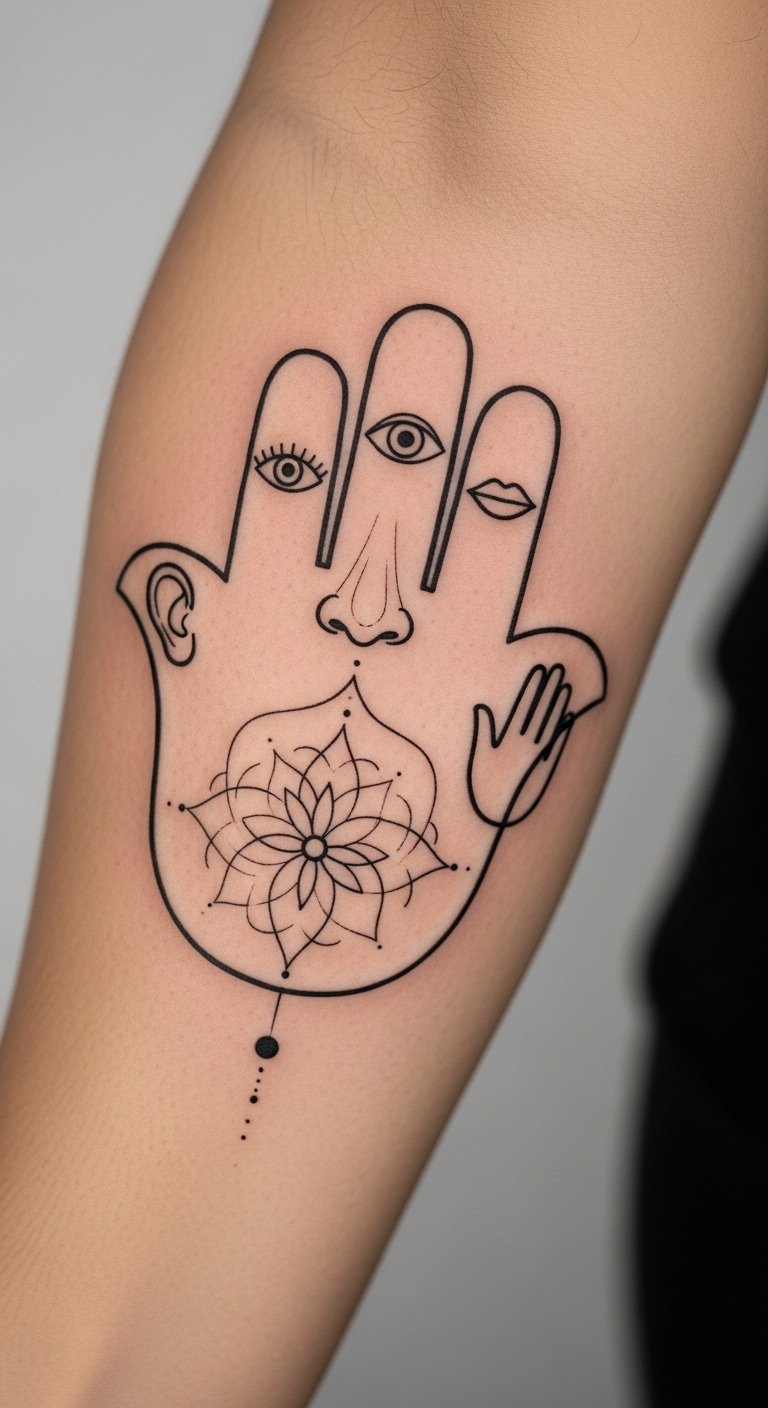 Hamsa with senses honors your perceptions. Each finger represents sight, sound, and more. A full-body guard. Sketch symbols freely. Tools are online. Around $100. Keep it clear. Use stickers first. Steps: list senses, add, ink. This theme awakens you. Tailor it. Begin.