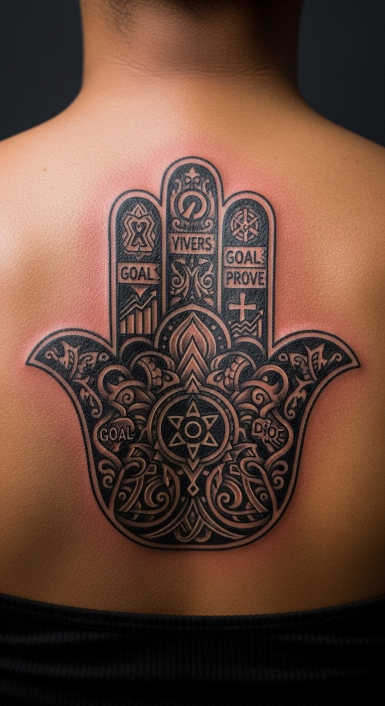 Dive into the classic upward Hamsa tattoo. This design points fingers skyward for strong protection against bad vibes. It keeps things simple yet powerful. Think of it as your daily shield. Start by sketching ideas on paper. Use free online apps to draw your own version. Pick a local artist who specializes in spiritual symbols; many offer affordable sessions under $100. Add personal touches like a small star near the eye. Break it down: research designs online, then chat with friends about theirs. This helps you decide fast. Go for black ink to keep costs low. You’ll feel more grounded right away. Try a temporary tattoo first with henna kits from the drugstore. They cost less than $10 and let you test the look. Focus on what matters: your peace of mind. In a few steps, you have a tattoo that works for you.