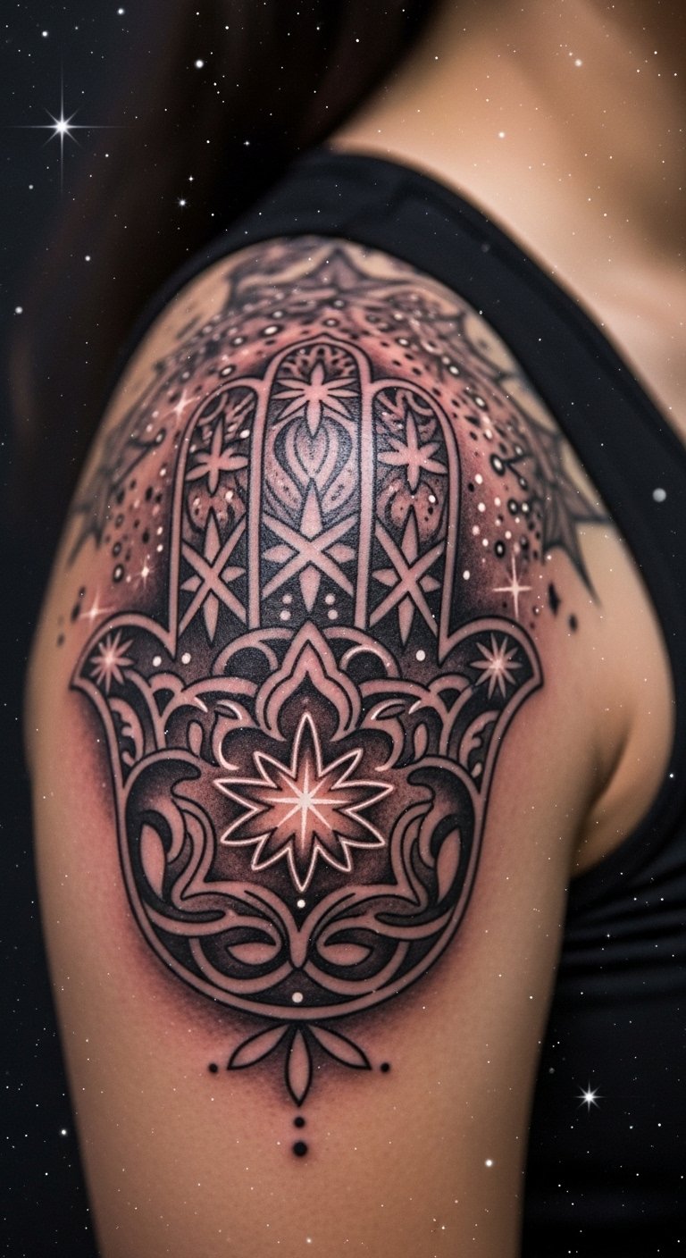 Cosmic Hamsa adds stars for universe feel. It pulls in cosmic energy. A starry shield. Sketch space elements. Free apps assist. About $95. Use shades. Test with drawings. Process: star it, design, ink. This vibes high. Customize. Begin.