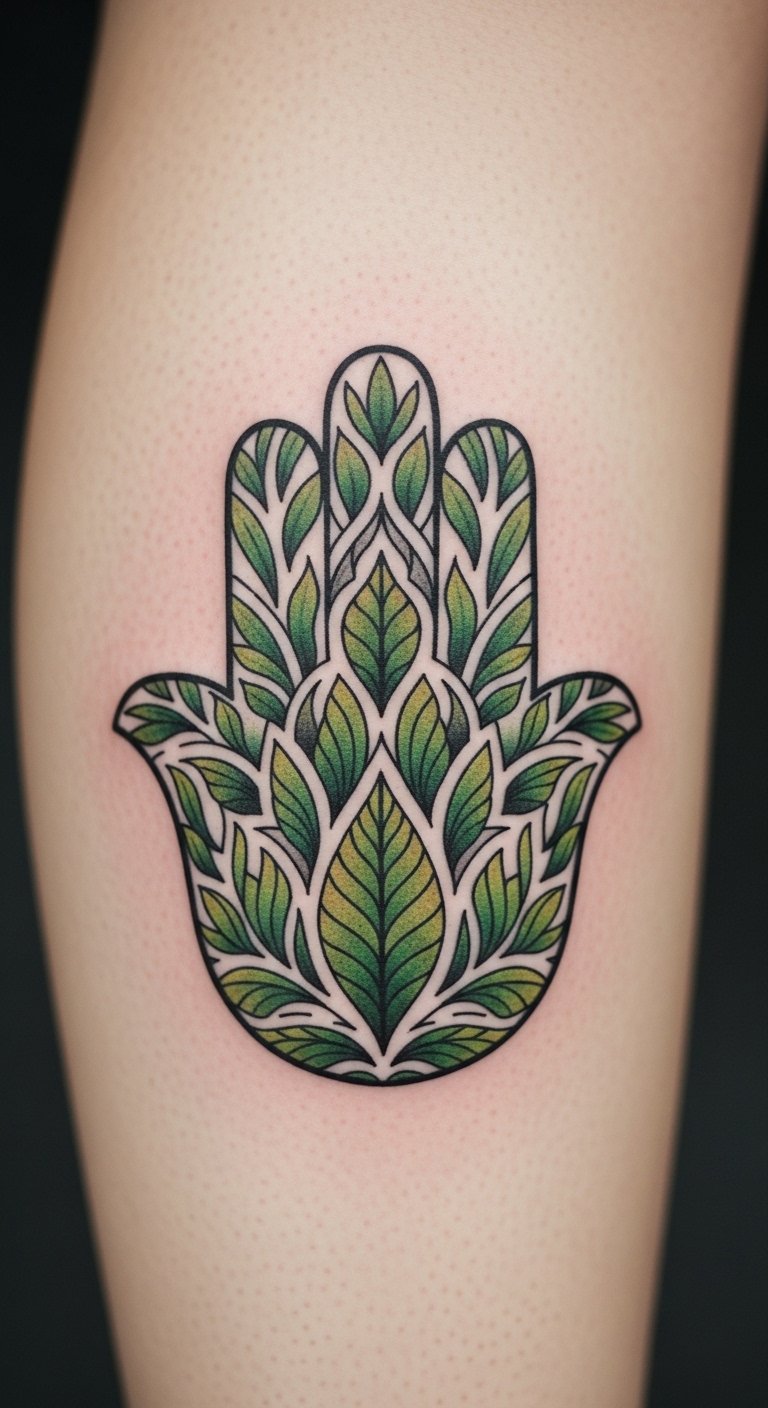 Nature Hamsa grounds you with leaves and trees. It connects to the earth for protection. A natural shield. Sketch outdoor elements. Free nature apps. Around $95. Use greens. Practice outdoors. Steps: nature add, design, ink. This roots you. Make it green. Try.