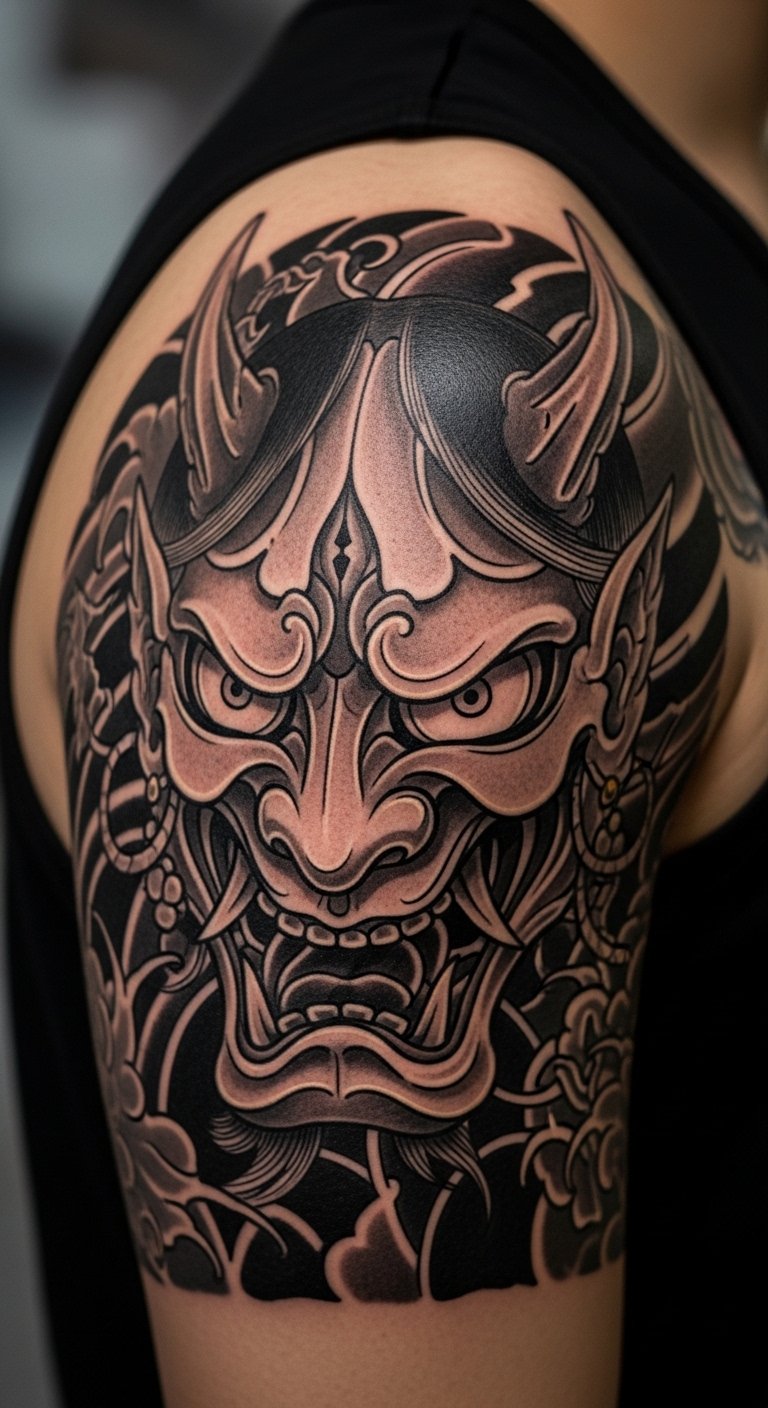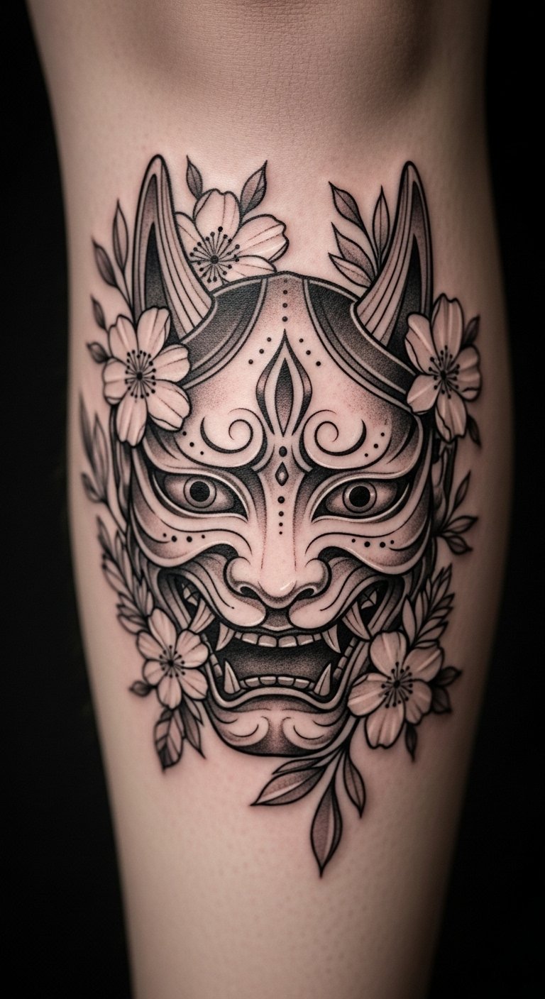 Flowers soften a Hannya tattoo. Add petals around the horns for balance. Keep costs down with smaller add-ons. Expect around $150 for extras. Use flower stencils for DIY trials. Press them onto skin with safe paints. Quick and cheap. Bold the flowers to highlight growth. Mix with casual jeans. Find artists who offer free consultations. This design adds a fresh twist.