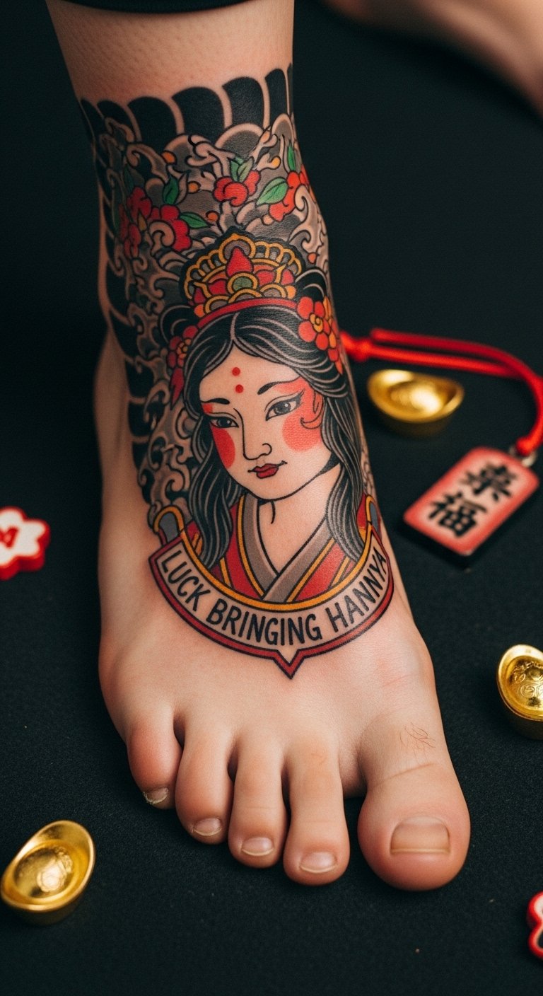 Lucky charms bring fortune to Hannya. Include coins or leaves. Budget $100. Make charms with stickers DIY. Apply and remove easily. Fun trial. Bold the charms. Foot designs stay hidden. Look for online vouchers. This design attracts luck.