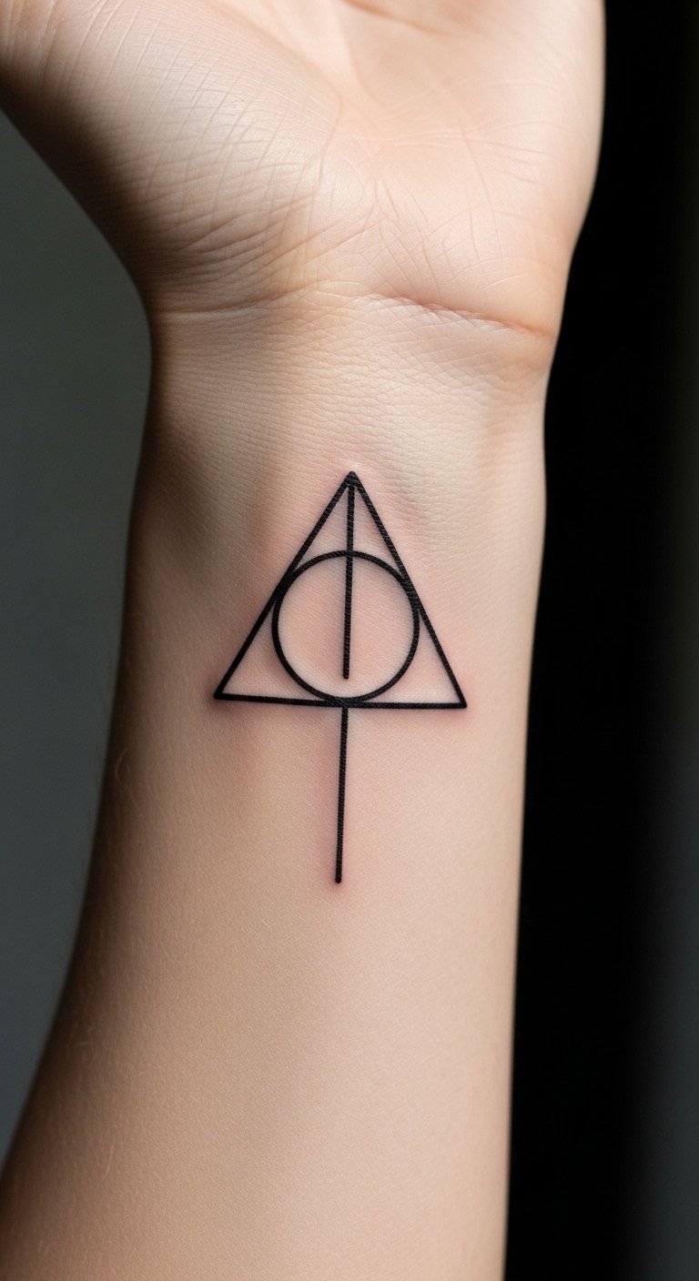Dive into a simple yet powerful design with the Deathly Hallows. This tattoo uses just a few lines for the iconic triangle, circle, and line. Think small and meaningful. Place it on your wrist for easy visibility. For a budget option, sketch it yourself on paper first using a basic pen. Find free online templates to trace. If you’re handy, practice drawing with a temporary tattoo kit from a dollar store. Keep costs low by visiting a local artist during off-peak hours. Bold the key: free templates. Mix it with a personal touch, like adding a small star. Easy steps: Print a design, trace it, and apply a henna version at home. You’ll love how it sparks daily reminders of the story’s depth.