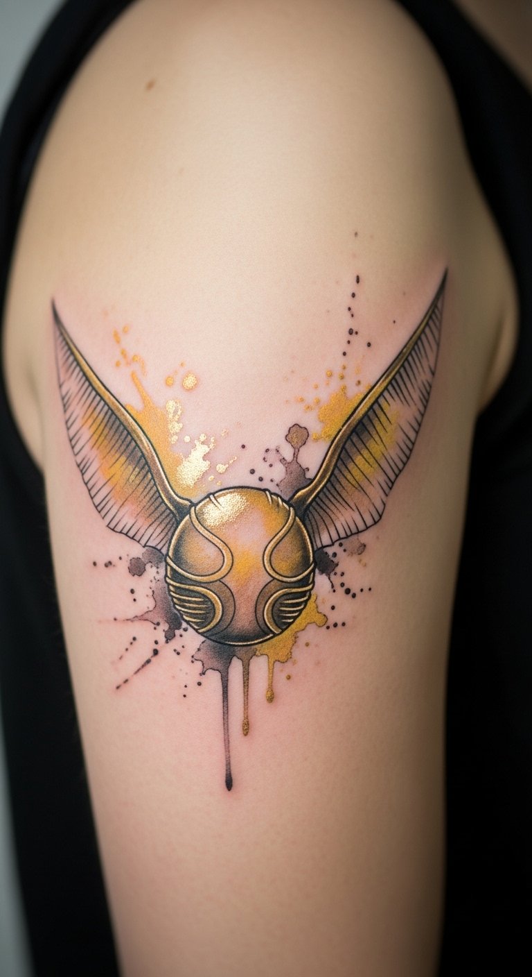 Bring the Golden Snitch to life with watercolor vibes. This design features soft, blended colors that mimic flight. Picture golden shades fading into the skin. Put it on your arm for a fun pop. Save money by trying watercolor pencils on paper to mimic the look. Grab a cheap set online for under $10. For a DIY try, use washable markers on your skin to test it out. Visit community art fairs for affordable artists. Highlight this: washable markers. Combine it with a small broomstick for extra flair. Simple action: Draw a rough version at home, snap a photo, and share for feedback. It’s a playful way to show your love for Quidditch.