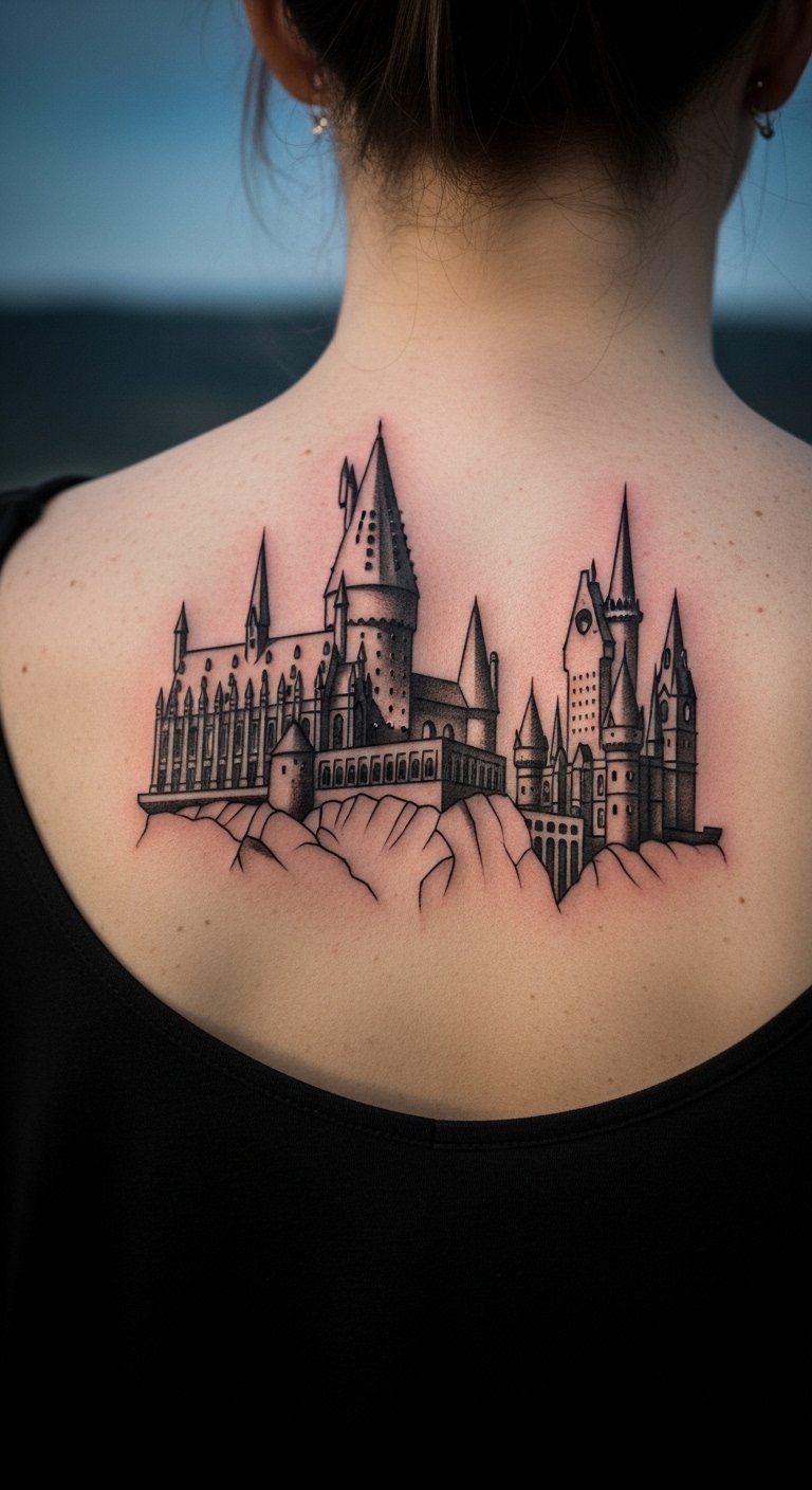 Capture Hogwarts as a bold silhouette. This design outlines the castle’s towers simply. Place it on your back for a grand statement. Save by printing free castle drawings to trace. Use a budget sketchbook from the store. Try a homemade version with charcoal sticks. Scout affordable fairs for artists. Highlight: free castle drawings. Blend in stars or a moon. Action plan: Sketch on paper, adjust size, and test with a stamp. It’s your gateway to magic every day.