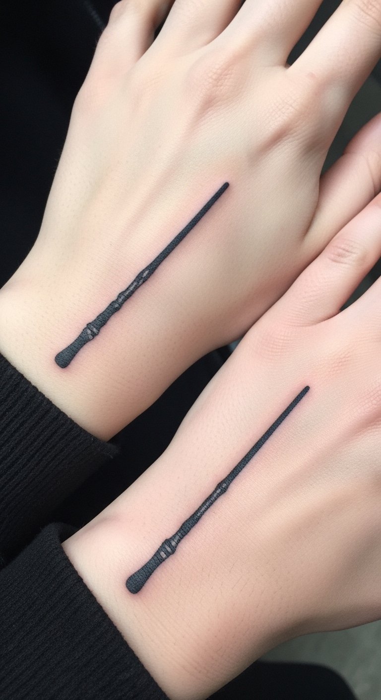 Share the fun with matching wands for your pals. Each one mirrors the other’s simple stick shape. Put them on your hands for easy high-fives. Cut expenses by designing together using free software. Grab stickers for temporary tries. Do a DIY with washable pens. Look for group deals online. Bold: free software. Customize with initials. Tip: Plan a session, draw drafts, and apply temporaries first. These tattoos strengthen your bonds.