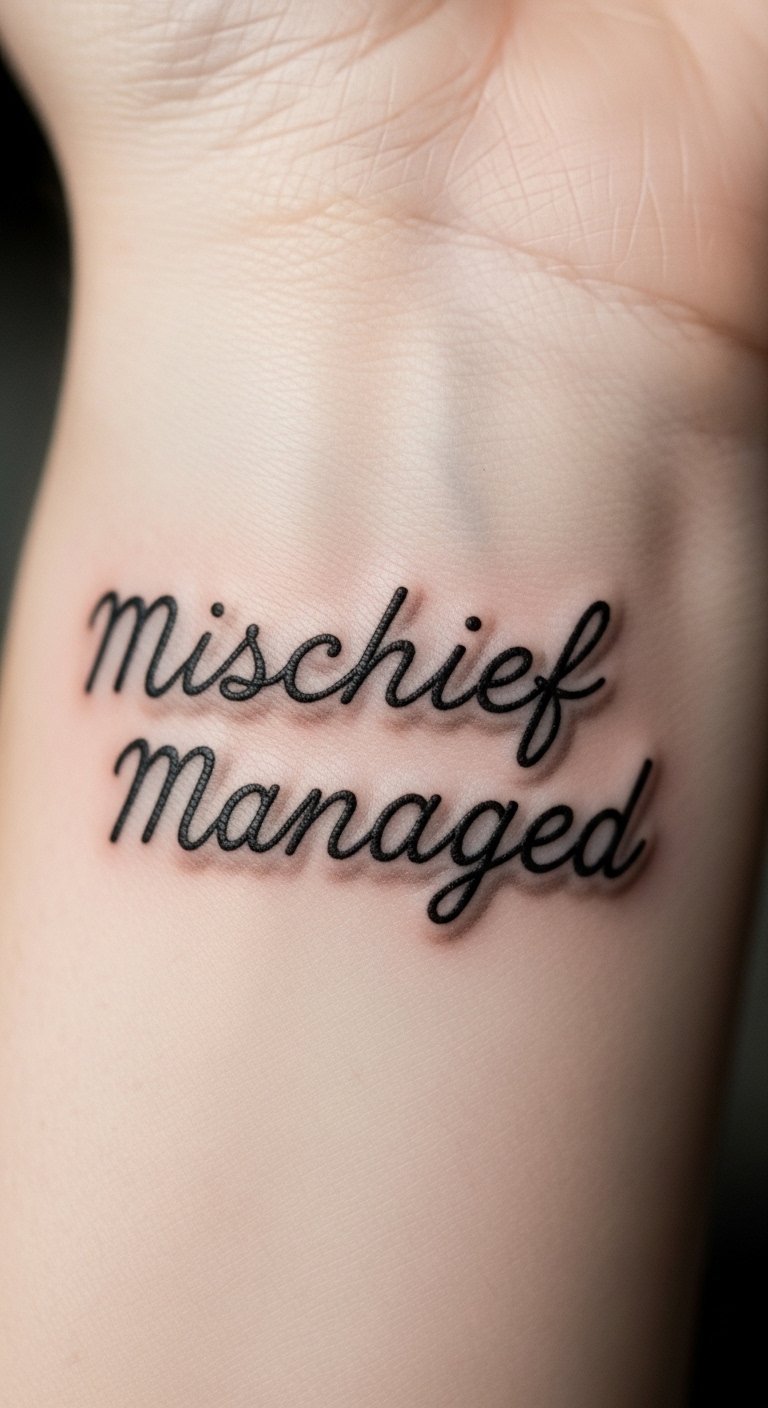 Ink the phrase “Mischief Managed” in neat script. It’s a quick, text-based design. Spot it on your wrist for constant views. Go budget by handwriting fonts at home. Use free apps for practice. Make a fake one with a marker. Find sales at local parlors. Emphasize: free apps. Add a small map element. Simple move: Write it on paper, test placement, and pick ink. It’s your secret code for adventure.