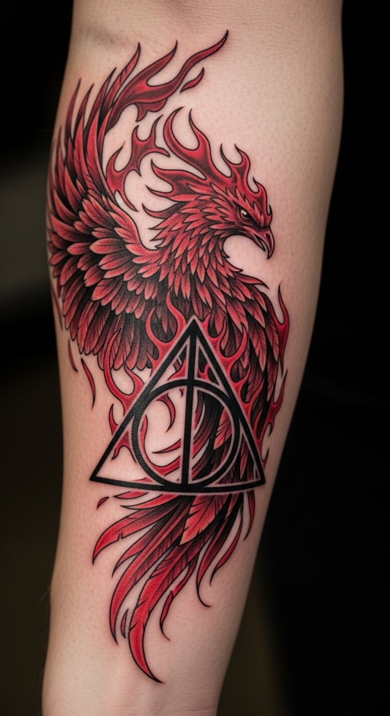 Mix a phoenix with Deathly Hallows for a dynamic pair. The bird’s flames wrap around the symbols. Place on your forearm for visibility. Save by drawing combos with cheap colored pencils. Use online tools for free. Try a crayon sketch at home. Seek out promo sessions. Bold: online tools. Personalize with colors. Tip: Sketch ideas, layer drawings, and mock it up. This design shows rebirth in style.