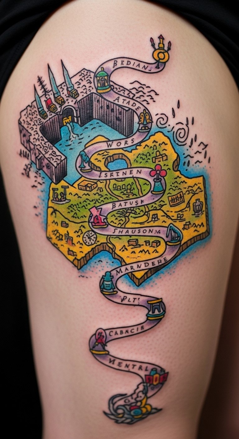 Create a vibrant Marauder’s Map tattoo. Fill it with colors and paths. Position on your thigh for space. Save by using free map sketches online. Draw with crayons at home. Make a paper version to fold. Look for package deals. Bold: free map sketches. Add footprints. Tip: Outline on paper, color in, and plan. It’s an adventure on your body.