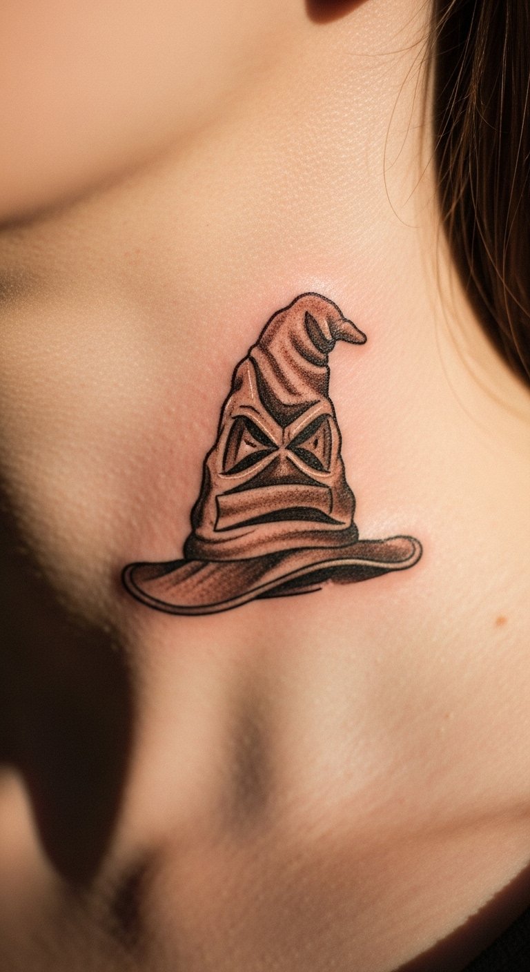 Ink a small Sorting Hat for a whimsical touch. Keep it understated. Put it on your neck for surprise. Go budget with free hat templates. Draw with markers. Make a hat accessory first. Find quick sessions. Emphasize: free hat templates. Personalize with a house. Step: Trace on paper, wear a mockup, and decide. It’s your inner self revealed.