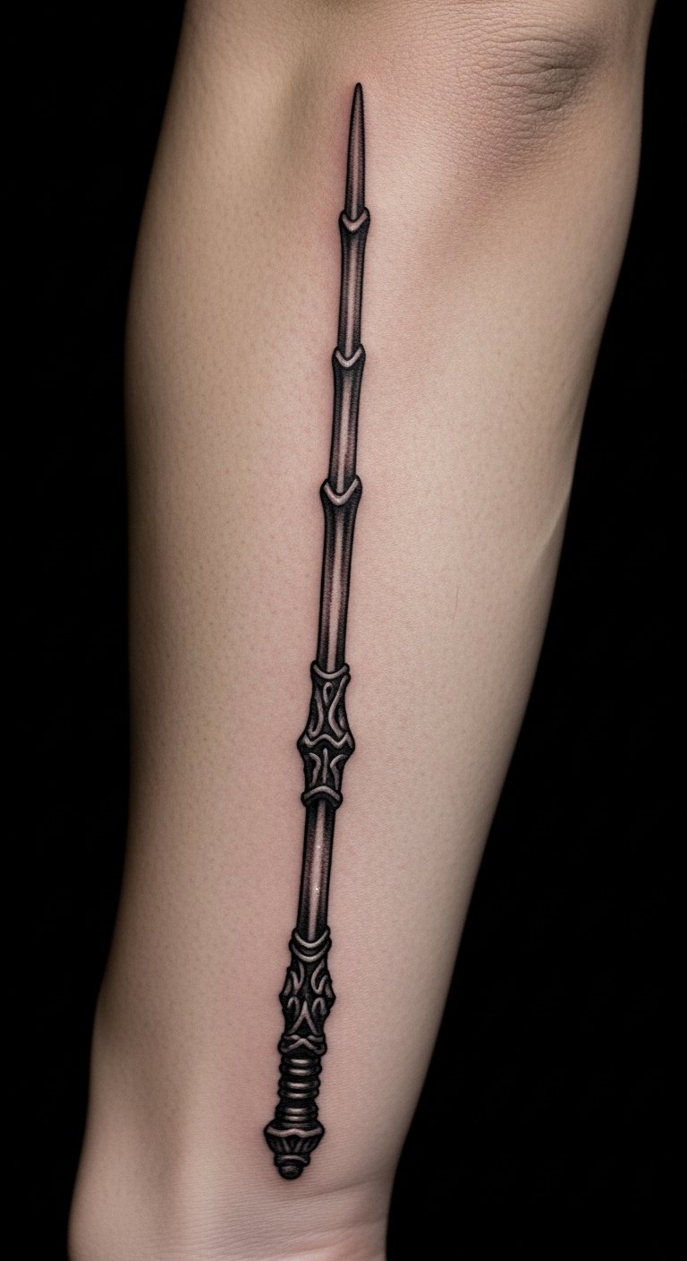 Feature the Elder Wand in a straight, powerful design. It’s clean and striking. Wear it on your arm for show. Save by using free wand vectors. Sketch with a ruler. Try a stick as a prop. Look for walk-ins. Bold: free wand vectors. Add runes around it. Tip: Measure on arm, draw simple, and go. It’s your power tool.
