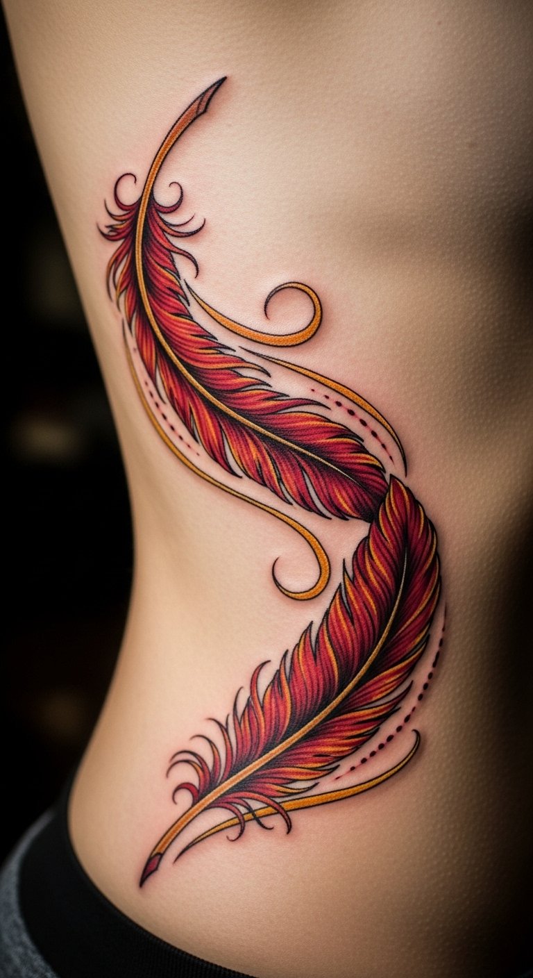 Trail feathers from Fawkes for a flowing look. Make it a line of reds and golds. Position on your side for flow. Go cheap with free feather patterns. Draw with pastels. Use ribbon to simulate. Seek sales. Emphasize: free feather patterns. Include a phoenix head. Step: Draw the trail, test with ribbon, and ink. It’s rebirth on you.