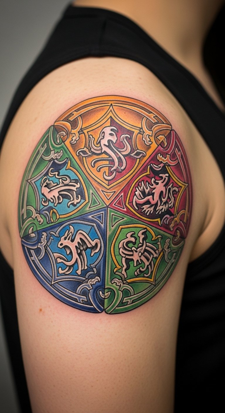 Unite all houses in one design for balance. Circle the crests together. Wear on your shoulder for unity. Go cheap with free house merges. Draw with colors. Use stickers for a mix. Find unity packages. Emphasize: free house merges. Personalize with your house. Step: Combine drawings, test the circle, and ink. It’s your fandom family.