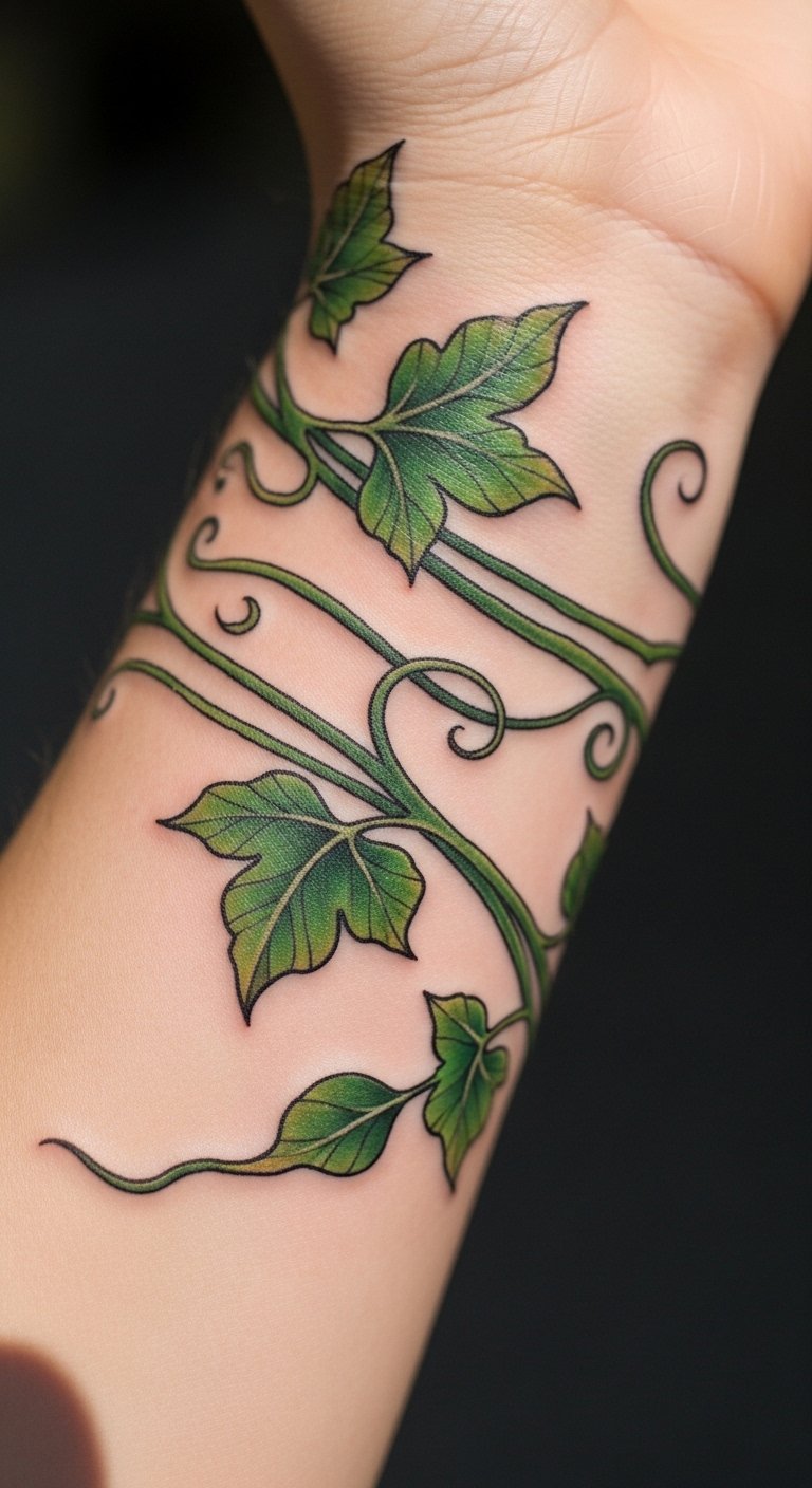 Maile vines offer a peaceful wrap. Try it around your wrist for daily charm. Download free vine patterns and tweak them. Draw with a sharpie at home for practice. Go with green tones for realism. A thin design saves on artist time. Look for coupon deals at local parlors. Use string to mimic the wrap on your arm. It gives a real feel. Add a few leaves for depth. This adds meaning without much cost.