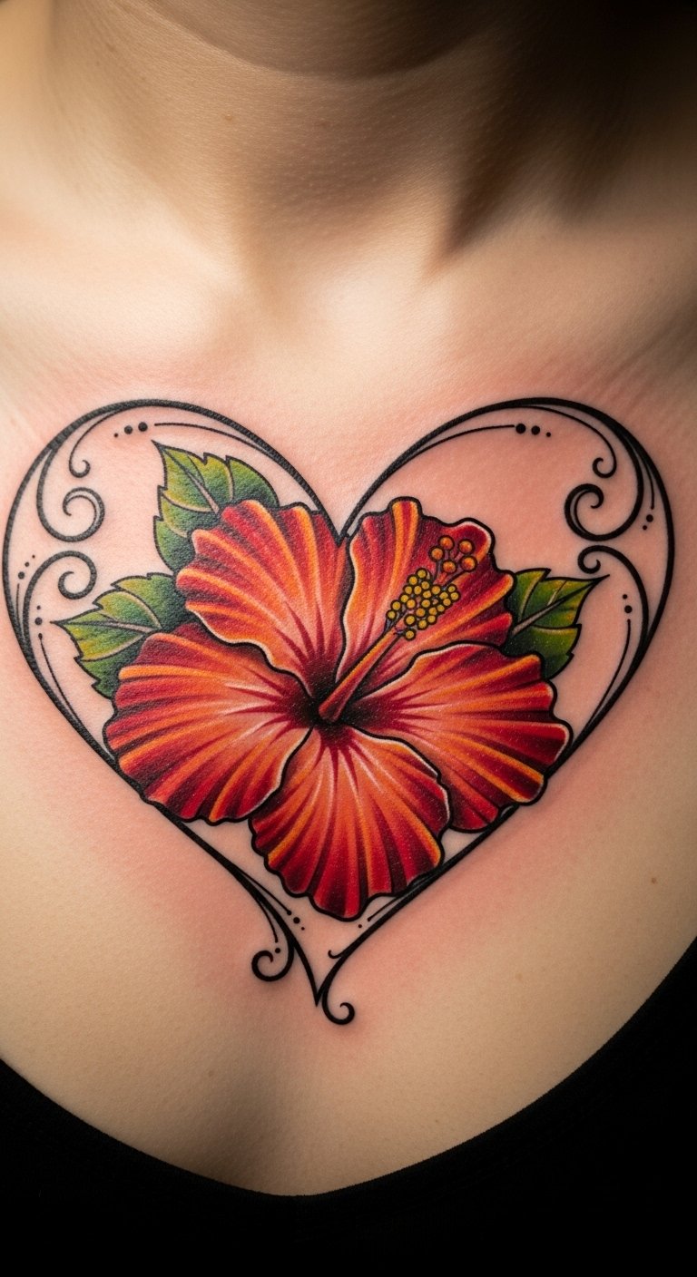 Hibiscus in a heart shows love. Center it on your chest for feeling. Combine free heart and flower outlines. Draw inside with a pen. Use red for passion. Keep the heart compact for savings. Look for love day deals. Test with heart-shaped stickers. Add the flower quick. This personalizes it right.
