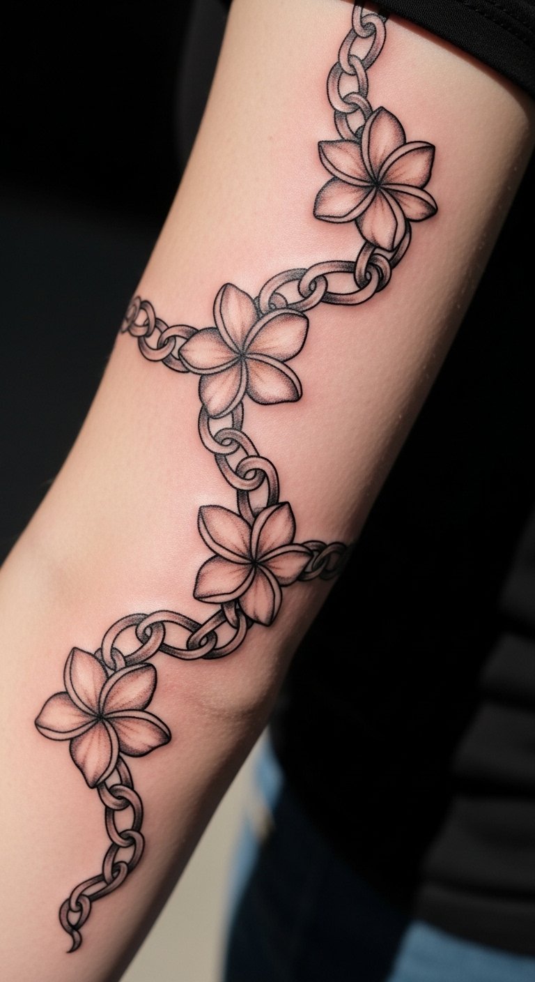 Plumeria chains link memories. Line them on your arm for story. Chain free flower designs together. Link with thread at home first. Go with pastel colors for softness. Make the chain short for affordability. Seek linking pattern artists. Use paper clips with drawings to practice. Add beads for extra links. This builds the chain easy.