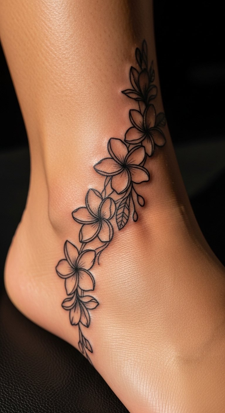 Plumeria flowers show up in many Hawaiian tattoos. They represent beauty and peace. Picture soft petals in black ink.