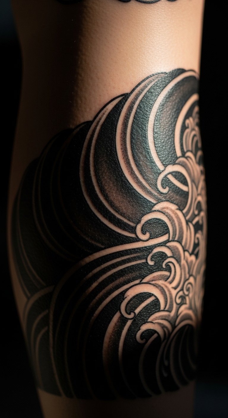 Ocean waves in tattoos represent power and change. They flow like the sea in black lines.