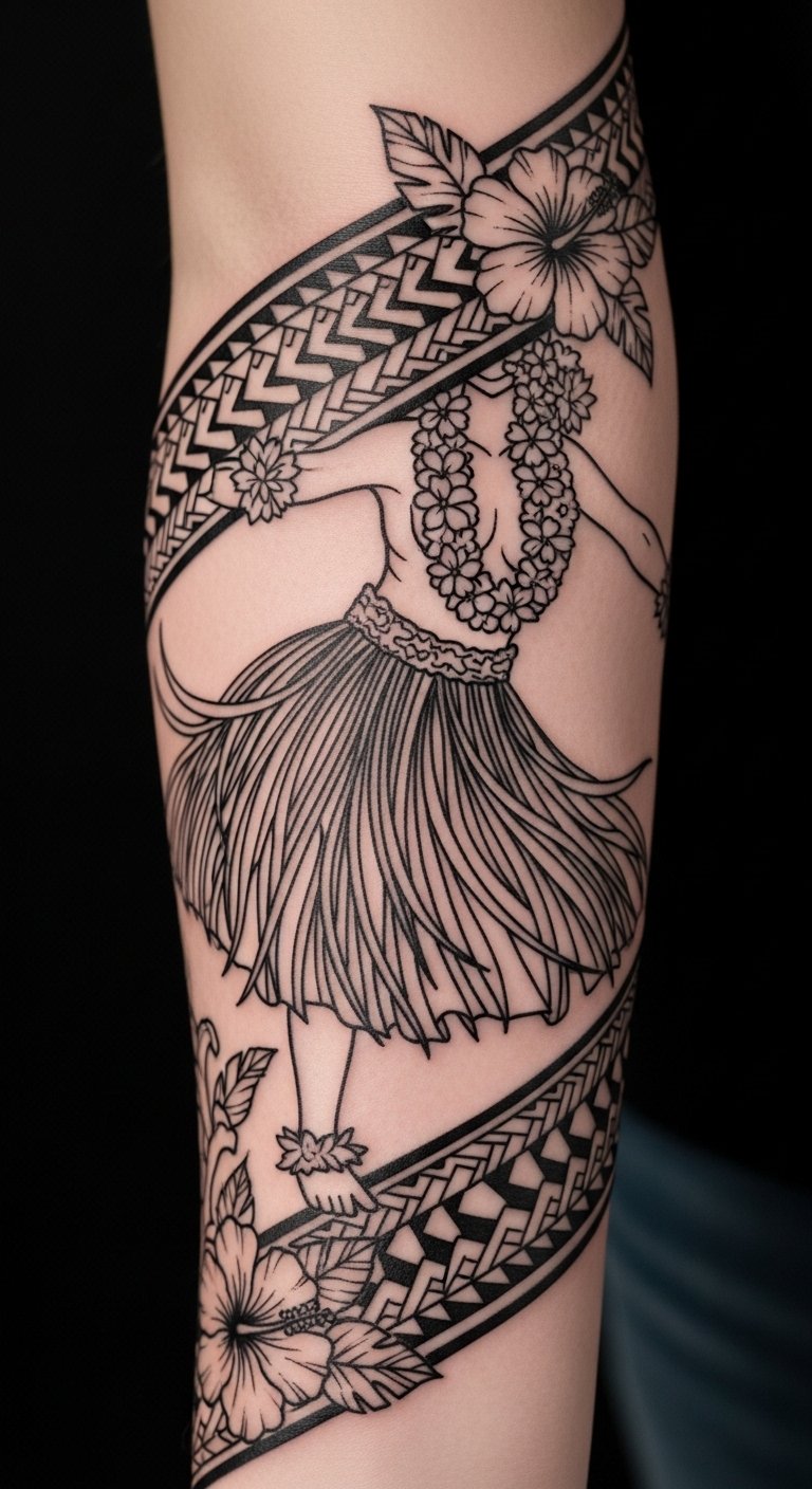 Hula dancer tattoos capture movement with dancer shapes. They embody grace.