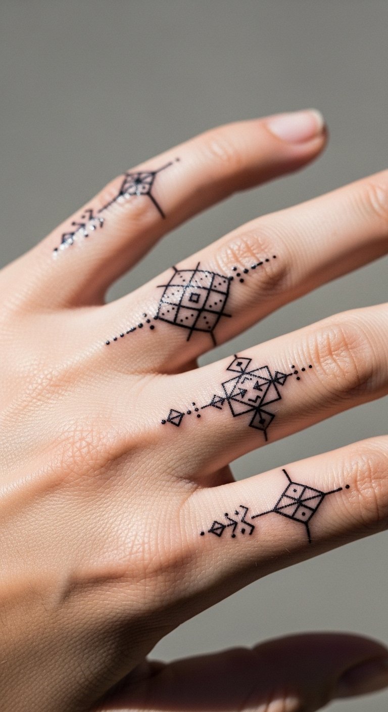 Finger tattoos use small patterns for everyday style. They are for women traditionally.