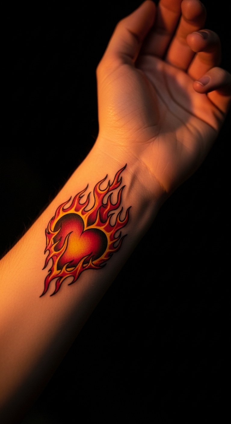 A flaming heart on your hand amps up the passion vibe. It shows strength and fire in your emotions, like a personal badge of resilience. Break it down: the flames add energy to a basic heart, making it pop. Draw a rough sketch using free apps on your phone to visualize it. Grab temporary stickers from dollar stores for under $2 to try on your hand. Opt for the back of your hand if you want it seen often. Local tattoo shops might have deals for small designs, around $60–80. Keep the size modest, say 2 inches, to fit neatly. Hand tattoos need more care, so use a simple aftercare routine with unscented lotion from your medicine cabinet. For a DIY feel, use washable markers to trace a flame pattern first. It’s fun and costs nothing extra. This design works for anyone marking a tough time, turning pain into power. Choose colors that match your skin tone for a natural look. Remember, it’s about what sparks joy for you.