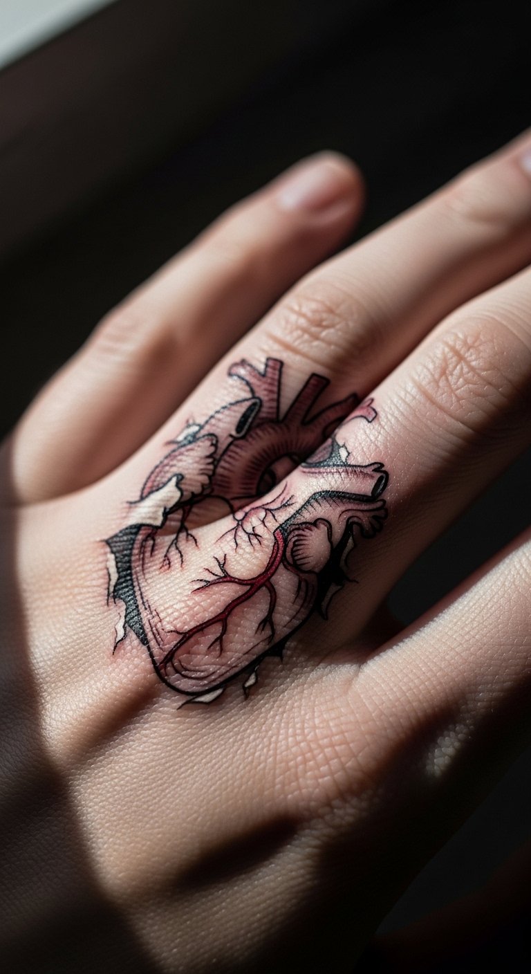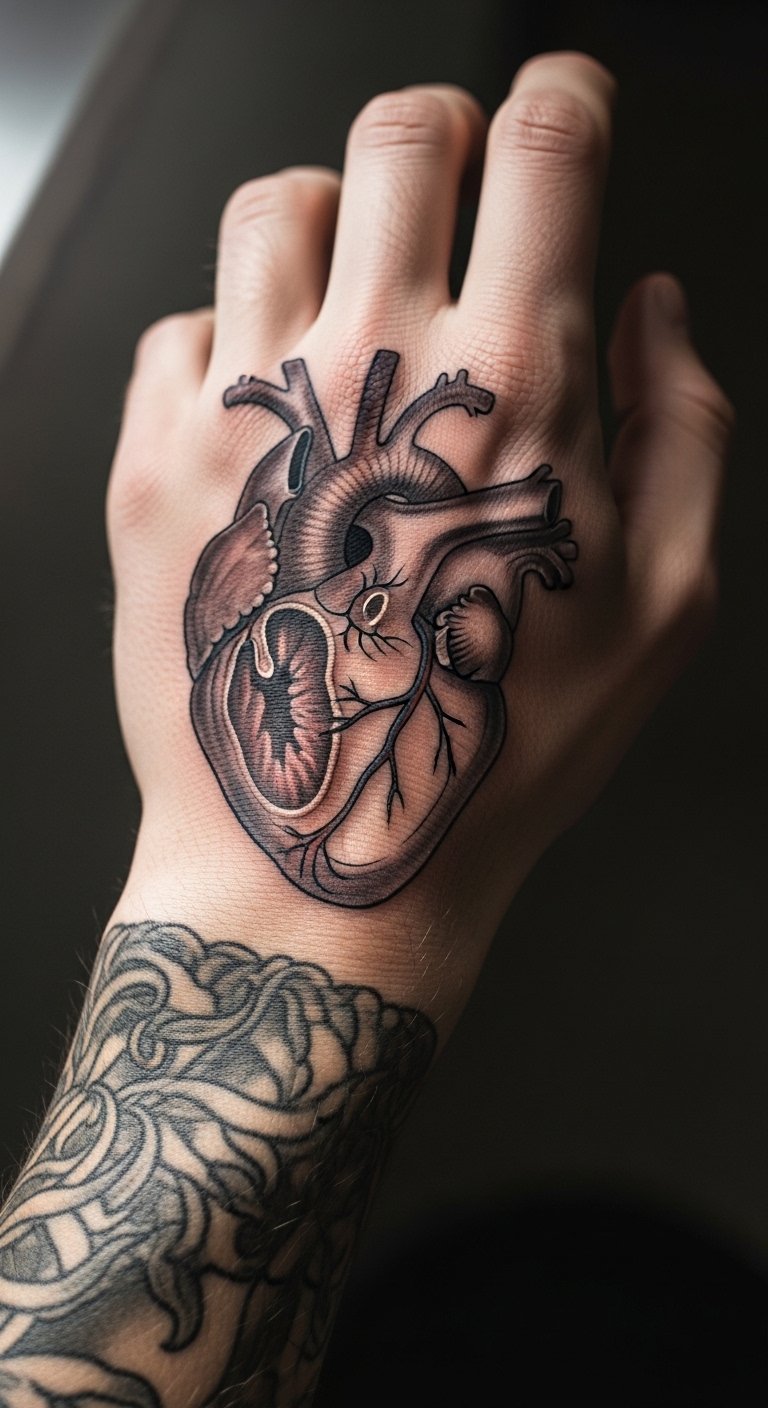 An anatomical heart on your hand brings a realistic, scientific edge. It highlights the body’s core with veins and details. Draw it from online images. Stick-ons are affordable. Try wrist. Cost around $80. Size modestly. Care with salve. Use diagrams for DIY. It adds an educational twist.