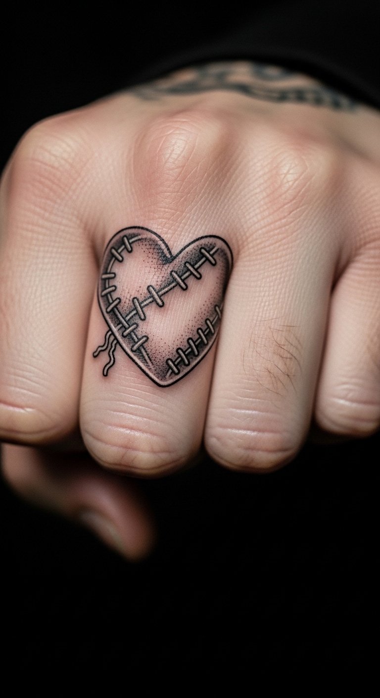 A stitched heart hand tattoo represents recovery and mending. It’s a visual of piecing life back together. The stitches add a healing narrative. Sketch on paper quickly. Temporaries cost little. Place on knuckle. Sessions at $70. Keep small. Use bandages for care. Sew fabric as DIY. It aids emotional growth.