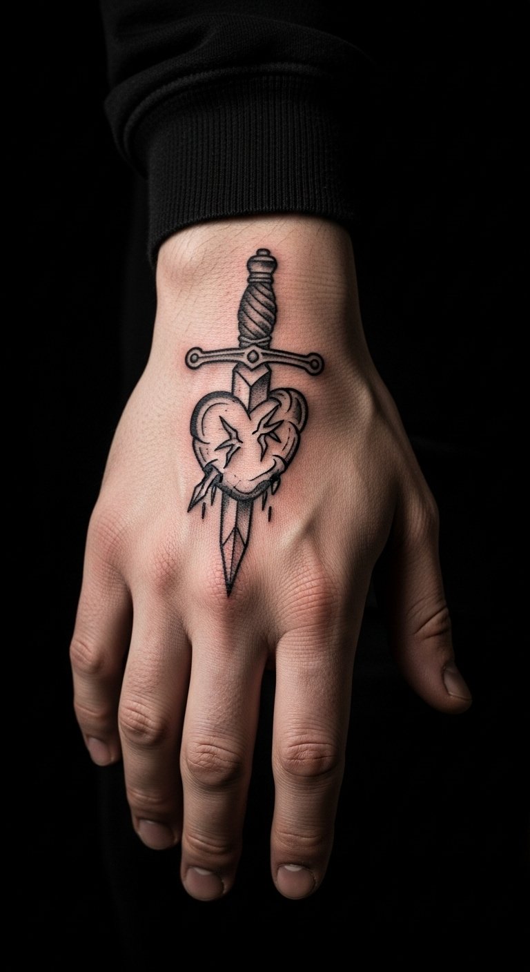 A dagger through heart on your hand shows bravery and endurance. It’s a bold mix of pain and passion. The dagger cuts through for impact. Sketch boldly. Temporaries online. Palm spot. $75 sessions. Size carefully. Use ointment. Draw with pins as DIY. It embodies resilience.