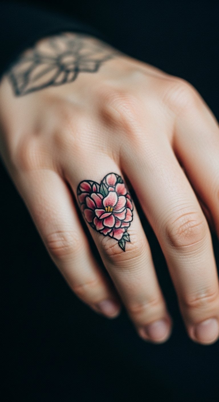 A floral heart on your hand blooms with growth and affection. Flowers around the heart add life. Sketch flowers. Fakes online. Finger test. Around $60. Keep fresh. Use oils. Press flowers as DIY. It symbolizes renewal.