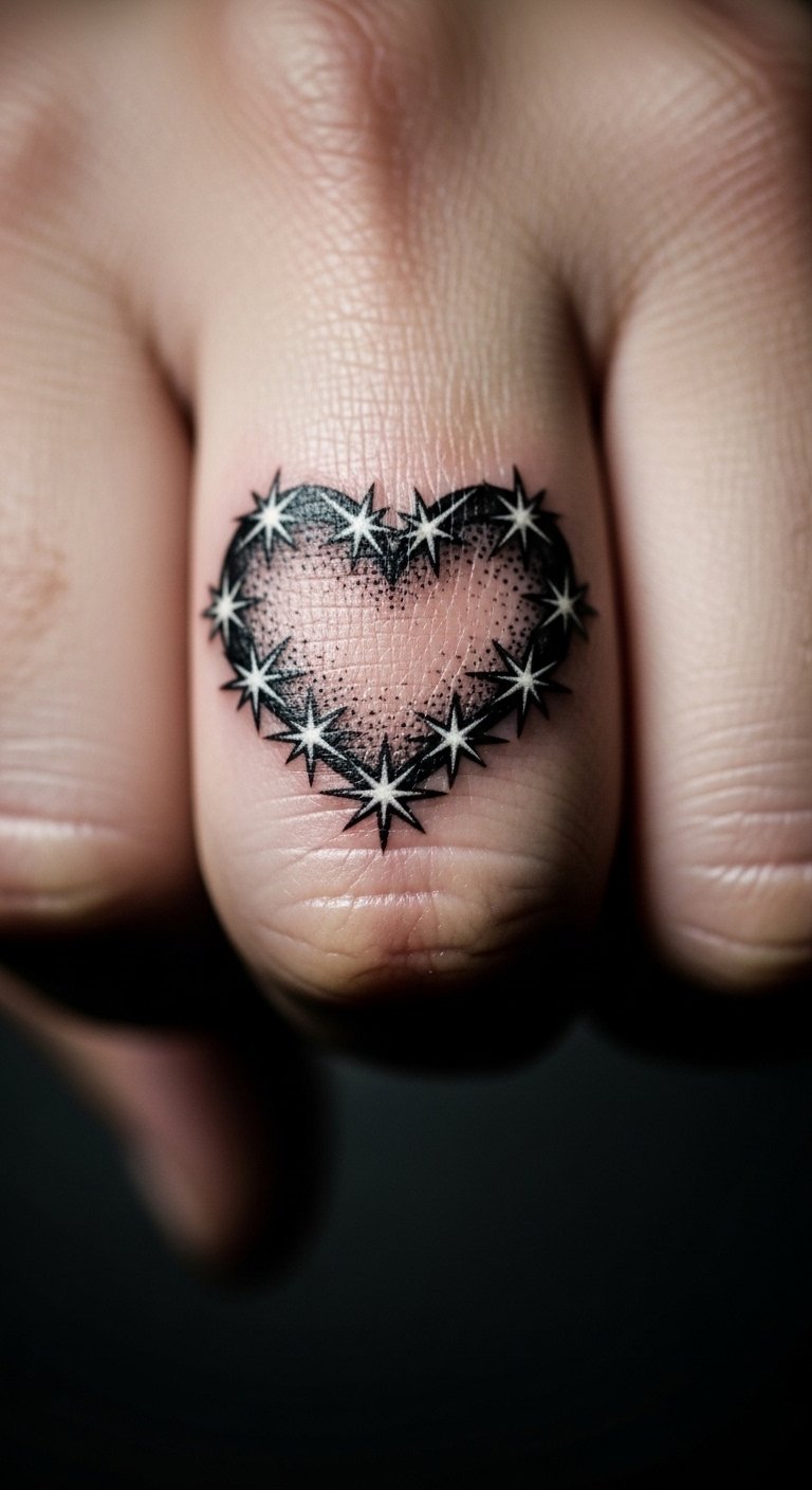 A star heart on your hand shines with hope and dreams. Stars twinkle around for extra magic. Doodle stars. Temporaries fun. Knuckle spot. $50 cost. Size starry. Care easy. Stick stars as DIY. It lights up aspirations.