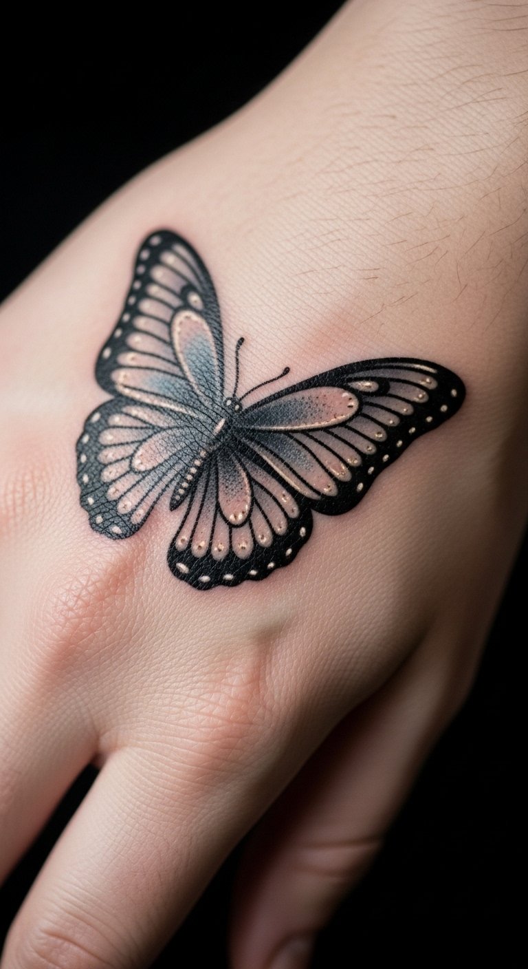 A butterfly heart on your hand represents change and beauty. Butterflies flutter around for transformation. Sketch wings. Stick-ons thematic. Back of hand. $70 sessions. Size light. Moisturize. Cut butterflies as DIY. It captures evolution.
