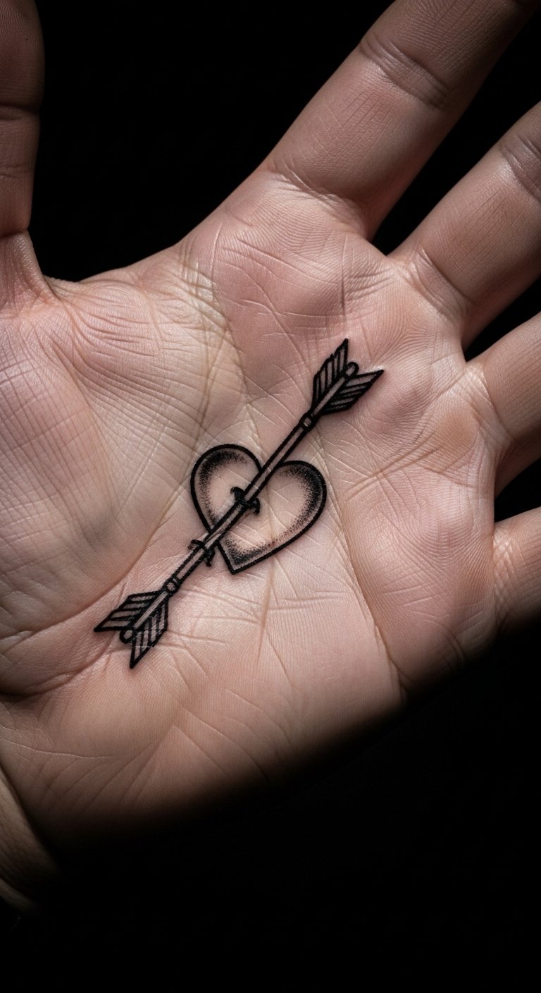 An arrow heart on your hand points to direction and passion. The arrow pierces for purpose. Draw arrows. Temporaries directional. Palm test. $60 cost. Size pointed. Use cream. Shoot arrows as DIY. It guides forward.