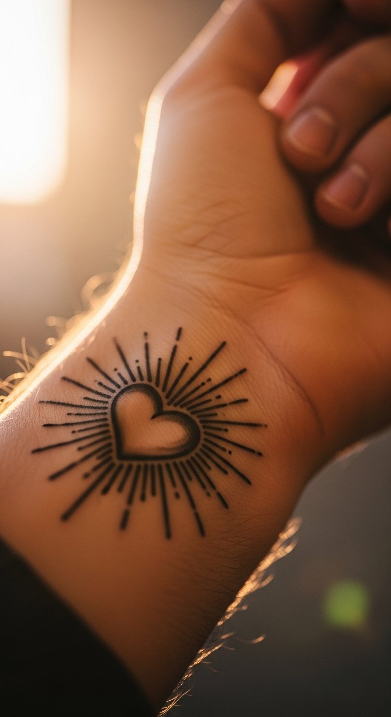 A sun heart on your hand radiates positivity and warmth. Rays beam out for energy. Doodle suns. Fakes sunny. Wrist spot. About $65. Keep radiant. Care with oil. Draw suns as DIY. It brings light.