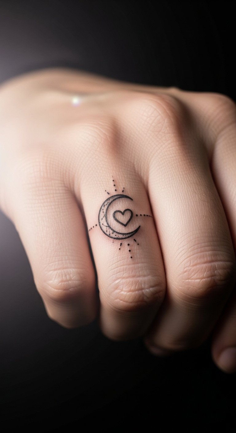 A moon heart on your hand evokes mystery and night-time love. The moon cradles the heart. Sketch moons. Stick-ons mystical. Finger choice. $55 fee. Size lunar. Basic lotion. Trace moons as DIY. It adds enigma.